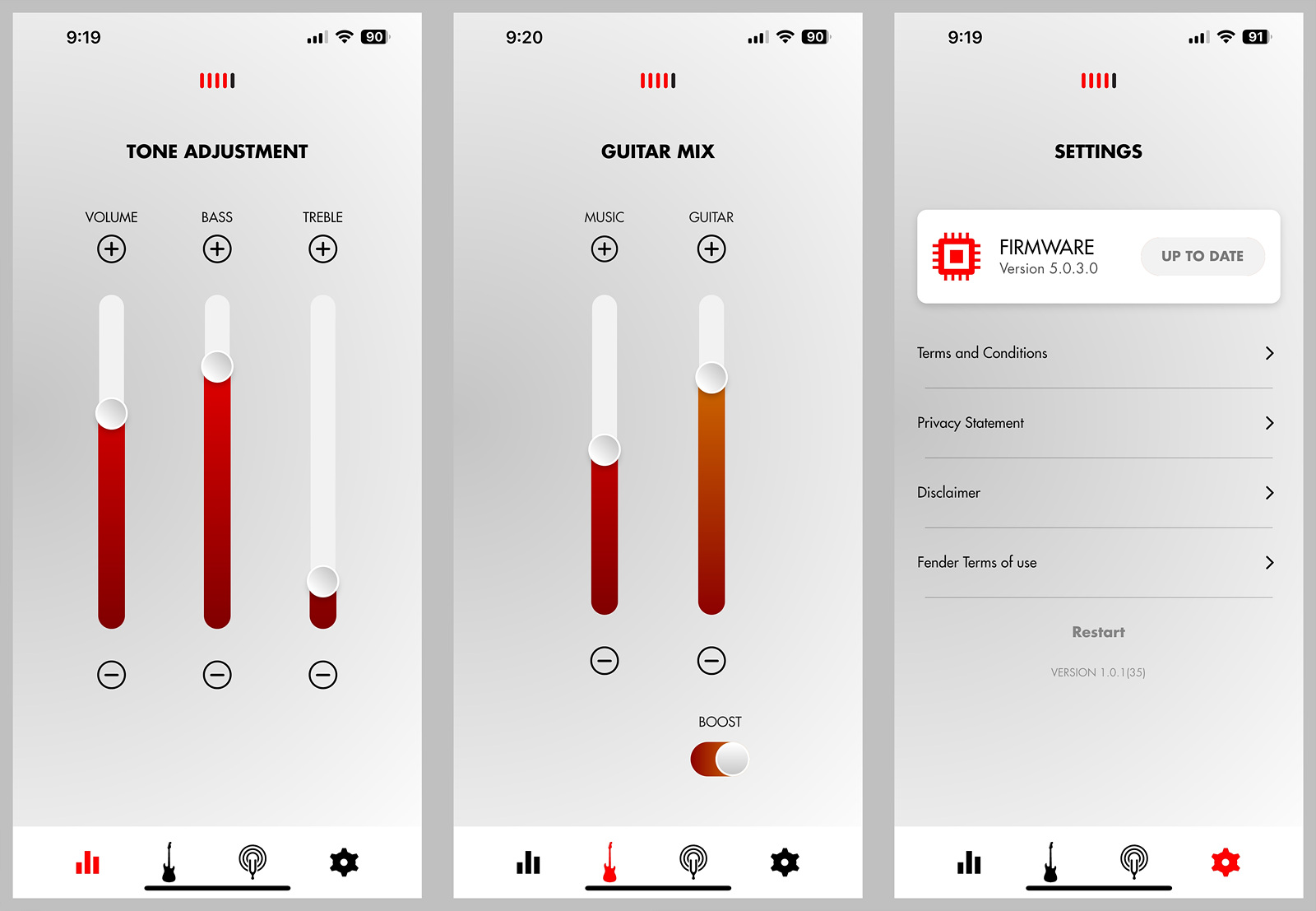 리프는 전용 앱(어플)을 사용할 수 있으며 기능이나 인터페이스 모두 꽤 단순한 편입니다. 여러 채널의 EQ를 만드는 대신 가장 기본적이자 예전 앰프 스타일인 BASS / TREBLE만 바꿀 수 있으며 이는 기기의 터치 버튼과 바로바로 연동이 됩니다. 볼륨, BASS, TREBLE의 현재 상태(값)를 수치로 확인할 수 없는 부분은 개인적으로 아쉬웠습니다. (이 항목은 앱을 소개하면서 항상 체크하는 부분입니다.)