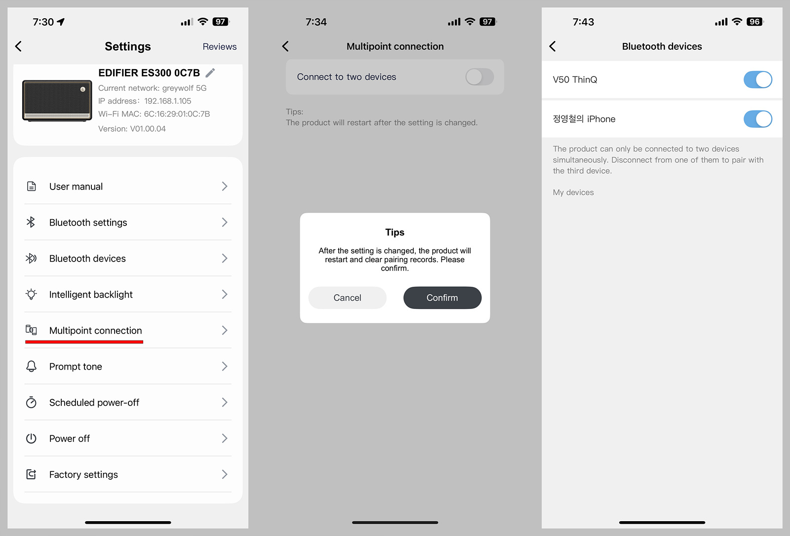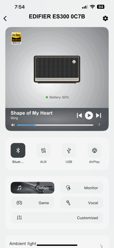 ES300은 전용 앱으로 스피커를 활용할 수 있는데 에디파이어 홈(Edifier Home) 앱을 설치해야 합니다. (설치 전 이름을 꼭 확인하세요.) 앱을 설치하고 나면 기기를 등록해야 하는데 이 과정은 블루투스가 아닌 와이파이(2.4GHz, 5GHz)로만 등록이 되며 블루투스 모드에서는 앱을 사용할 수 없습니다. 에어플레이를 위한 와이파이 기능은 당연하겠지만 와이파이가 없는 장소나 실외에서는 블루투스 연결로 앱을 사용할 수 없다는 건 큰 단점이라 생각합니다. 추후 앱이나 펌웨어를 통한 수정이 이루어지길 바랍니다.