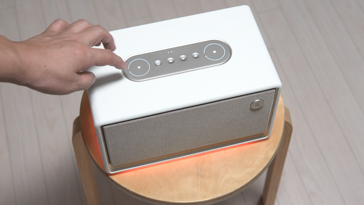 전원 버튼을 1-2초가량 누르면 스피커의 켜고 끌 수 있으며 상단 패널 역시 흰색으로 표시가 됩니다. 재생 기능과 관련된 터치 부분은 음각으로 되어 있어서 확실하게 구분이 되고 있으며