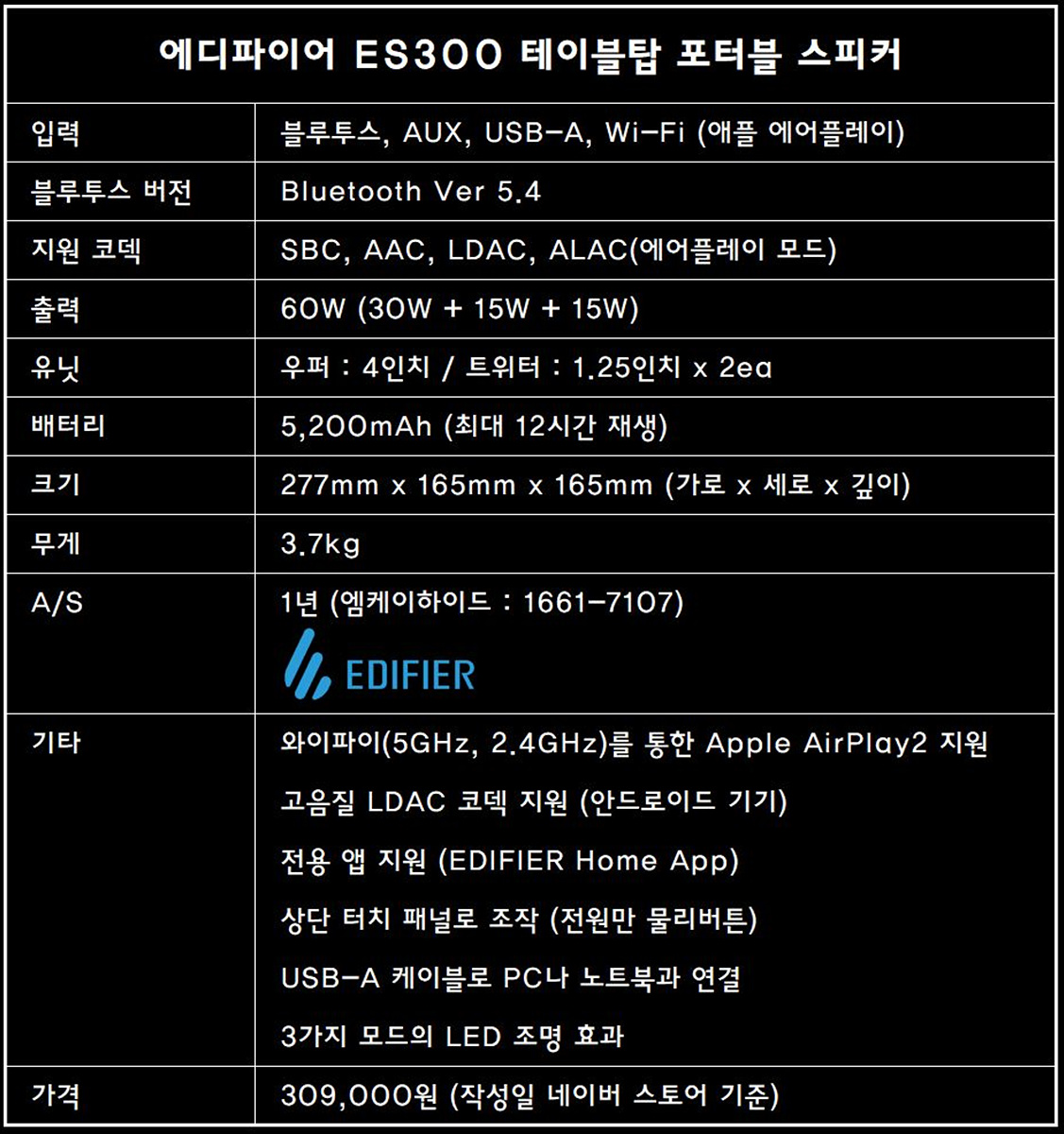 에디파이어 ES300은 블랙 / 화이트 두 가지 색이 있는데 박스에 있는 사진에서도 확인할 수 있습니다. 박스에는 스펙과 스피커의 특징들이 잘 표시되어 있는데 개인적으로는 LDAC, 애플 에어플레이에 대한 기능이 가장 눈에 띄었습니다.