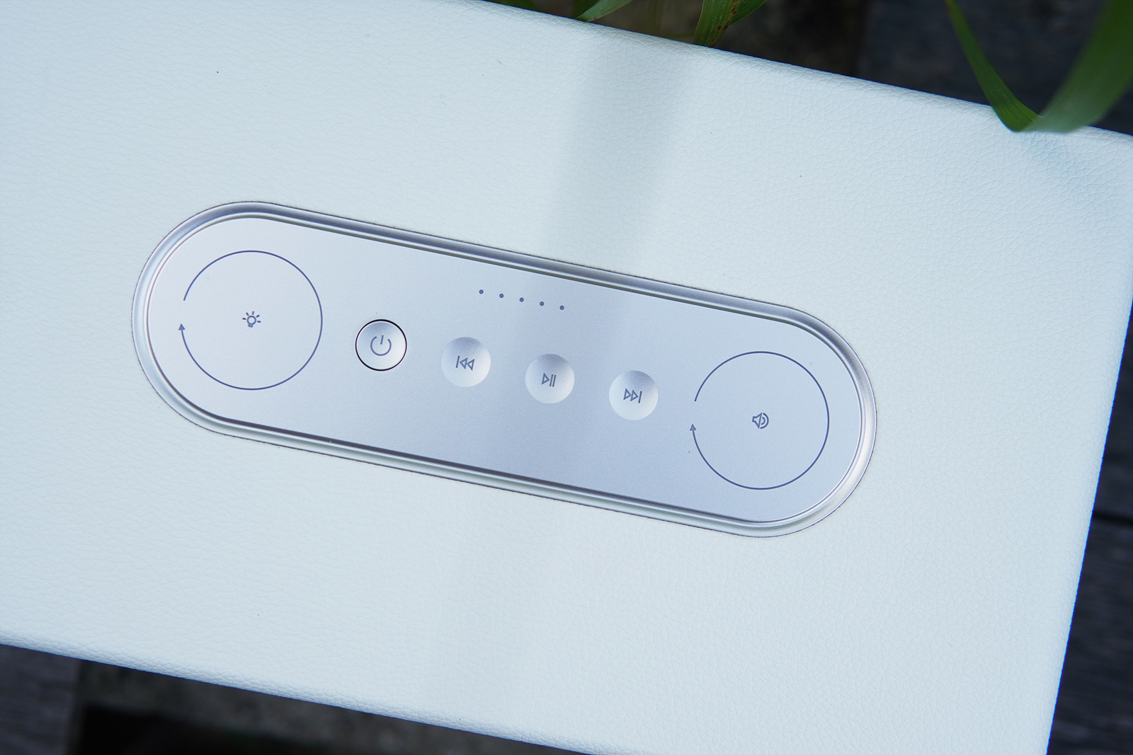 왼쪽부터 LED 밝기 조절, 전원, 이전 트랙, 재생/일시정지, 다음 트랙, 볼륨 조절 기능을 담당하고 있으며 위쪽 5개의 LED로 스피커의 배터리 상태를 확인할 수 있습니다. 전원 버튼만 유일하게 물리버튼으로 되어있고 나머지는 모두 터치로 동작합니다.