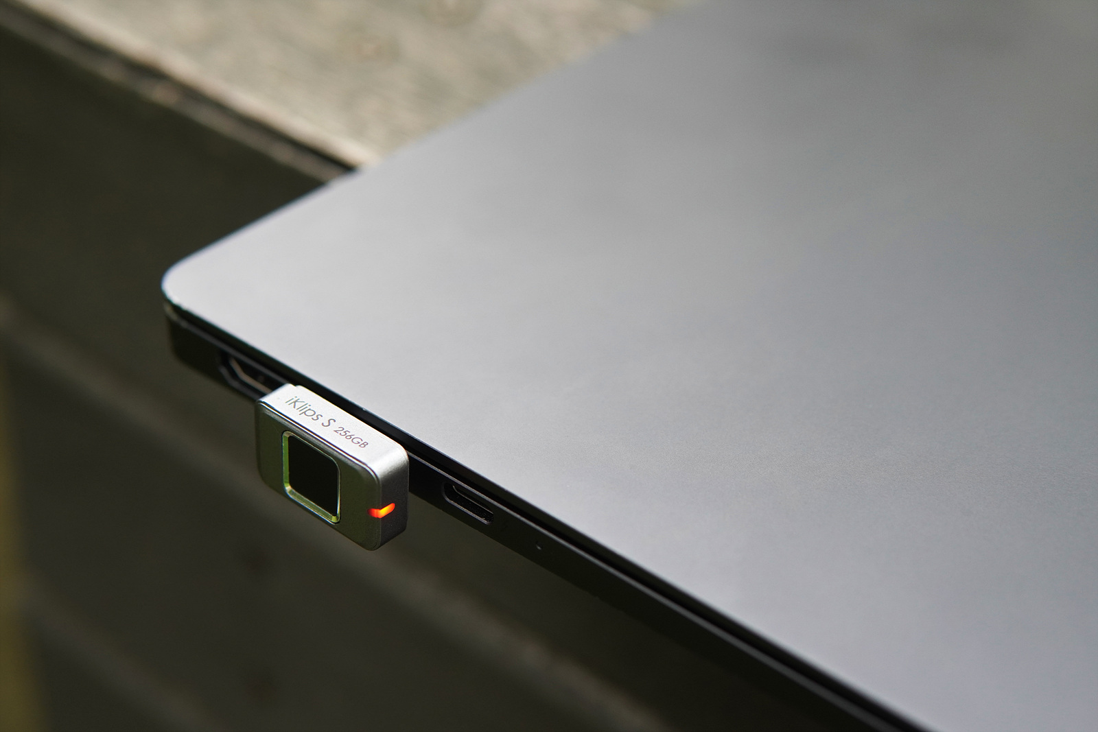 가운데는 지문을 인식할 수 있는 센서가 있고 양쪽으로는 스트랩을 고정할 수 있는 고리와 SSD의 현재 상태를 확인할 수 있는 LED가 있습니다. 지문 인식용 센서만 아니라면 크기가 더 작아졌을 거 같네요.