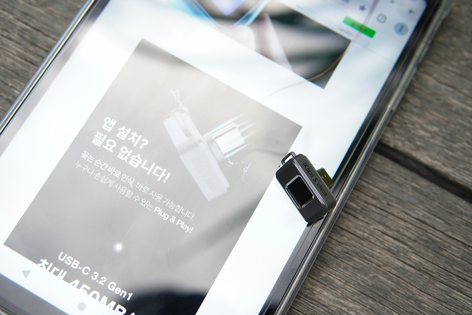 아이클립스 iKlips S를 기기와 연결하면 빨강 / 파란색 LED가 깜빡거리며 손가락을 인식하면 초록색으로 고정이 되며 기기의 잠금이 풀립니다. 기기에서 제품을 인식한 상태라 데이터를 복사하거나 백업할 수 있습니다.