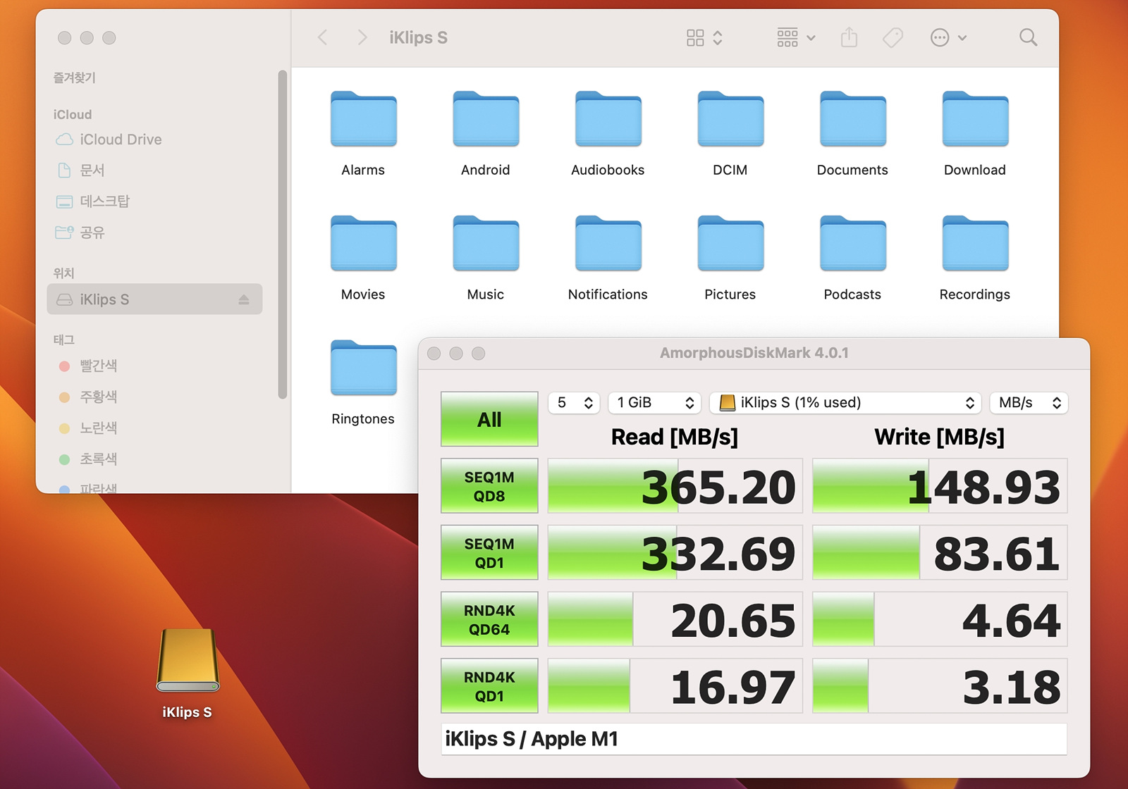 파일 시스템이 exFAT로 할당되어 있어서 맥, Windows뿐 아니라 안드로이드 기기에서도 사용할 수 있습니다. 벤치마크를 해보니 아이클립스 iKlips S의 스펙(읽기 450MB/s, 쓰기 400MB/s)을 만족하는 속도를 보여주었습니다. 속도만 본다면 일반적인 외장 SSD보다는 느리지만 제품의 크기를 생각한다면 충분히 만족스러운 성능이라 생각합니다.