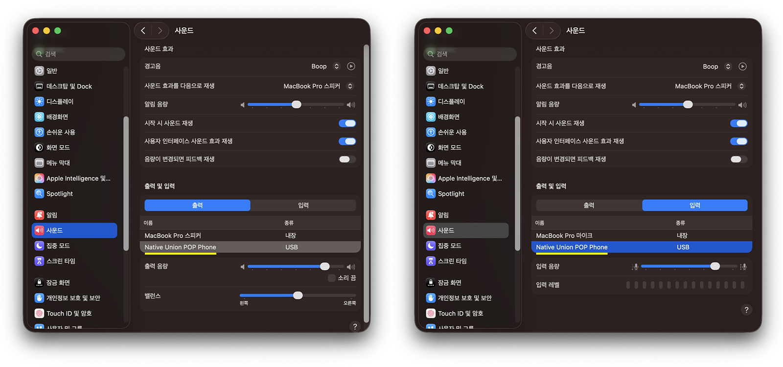 맥북 프로 역시 장치를 설정하면 바로 사용할 수 있으며 출력이나 마이크의 게인(입력)도 선택할 수 있습니다.