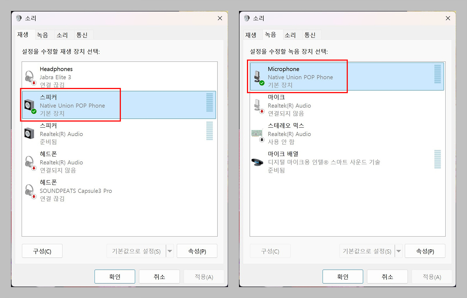 제어판 ▶ 소리에서 팝폰(Pop Phone)을 기본 장치로 지정하면 Windows에서도 사용할 수 있습니다.