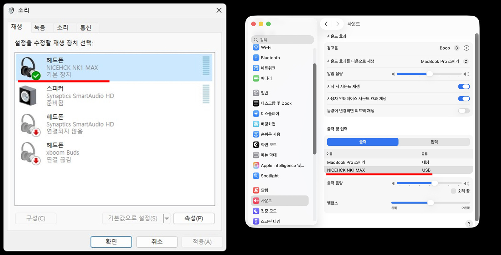 NK1 Max와 3.5mm 이어폰을 연결하면 위 화면처럼 출력 장치에 자동으로 등록이 됩니다. 혹시나 소리가 나오지 않는다면 제어판에서 기본장치로 선택하시기 바랍니다.
