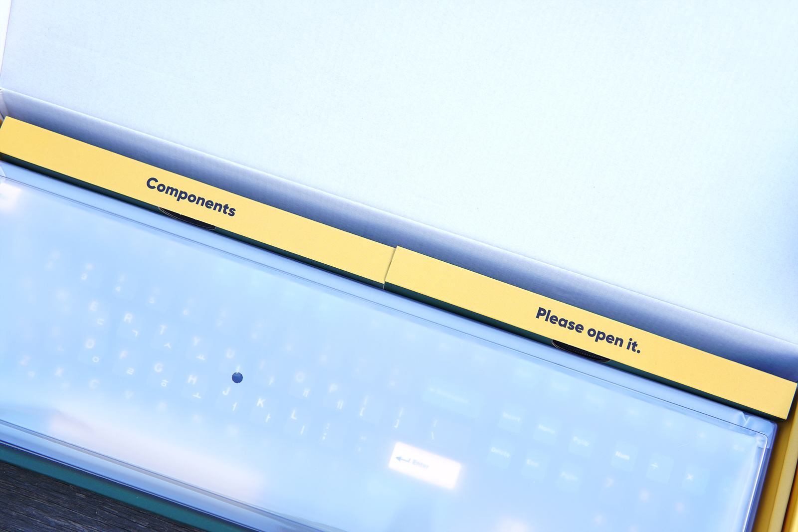 박스에는 제품의 스펙과 특징들이 자세하게 표시되어 있으며 안쪽에는 키보드의 구성품이 담겨있는 곳이 표시되어 있습니다. 누구나 쉽게 알 수 있는 부분이지만 그래도 이렇게 표시되어 있으니 좀 좋더군요.