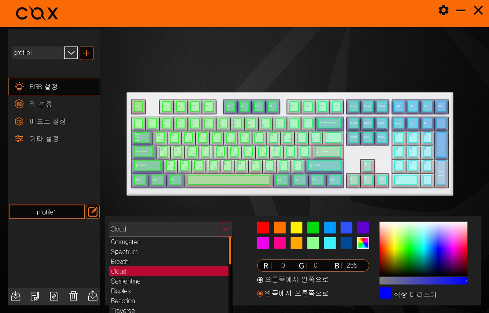 LED 모드는 상당히 많이 있으며 각각의 모드마다 빠르기, 밝기, 색을 바꿀 수 있습니다.