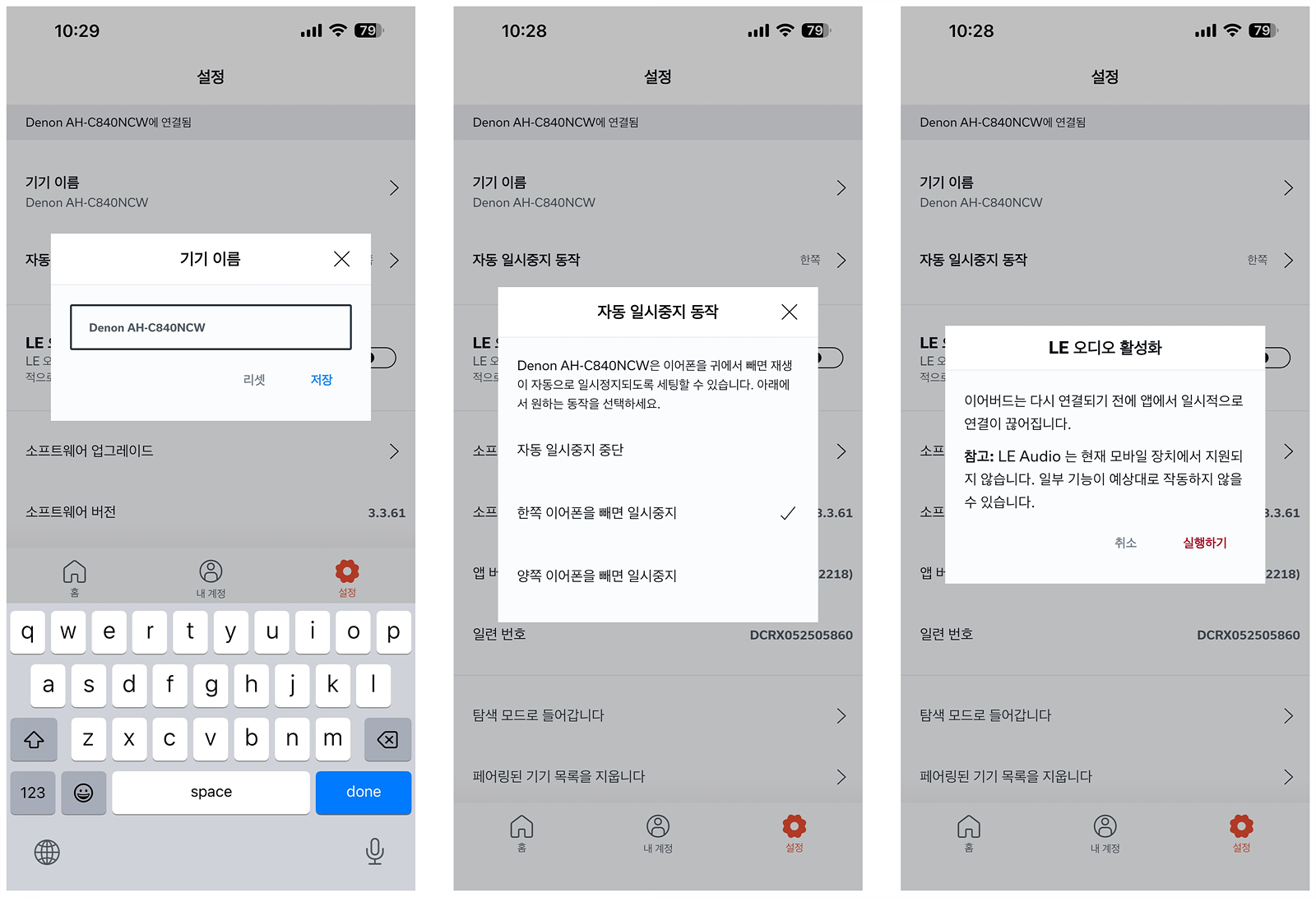 AH-C840NCW은 두 대의 기기에 연결할 수 있는 멀티포인트 기능을 지원하고 앱에서도 연결된 기기를 확인해서 해당 기능을 on/off 할 수 있으며 자동 전환 기능 역시 선택할 수 있습니다.
