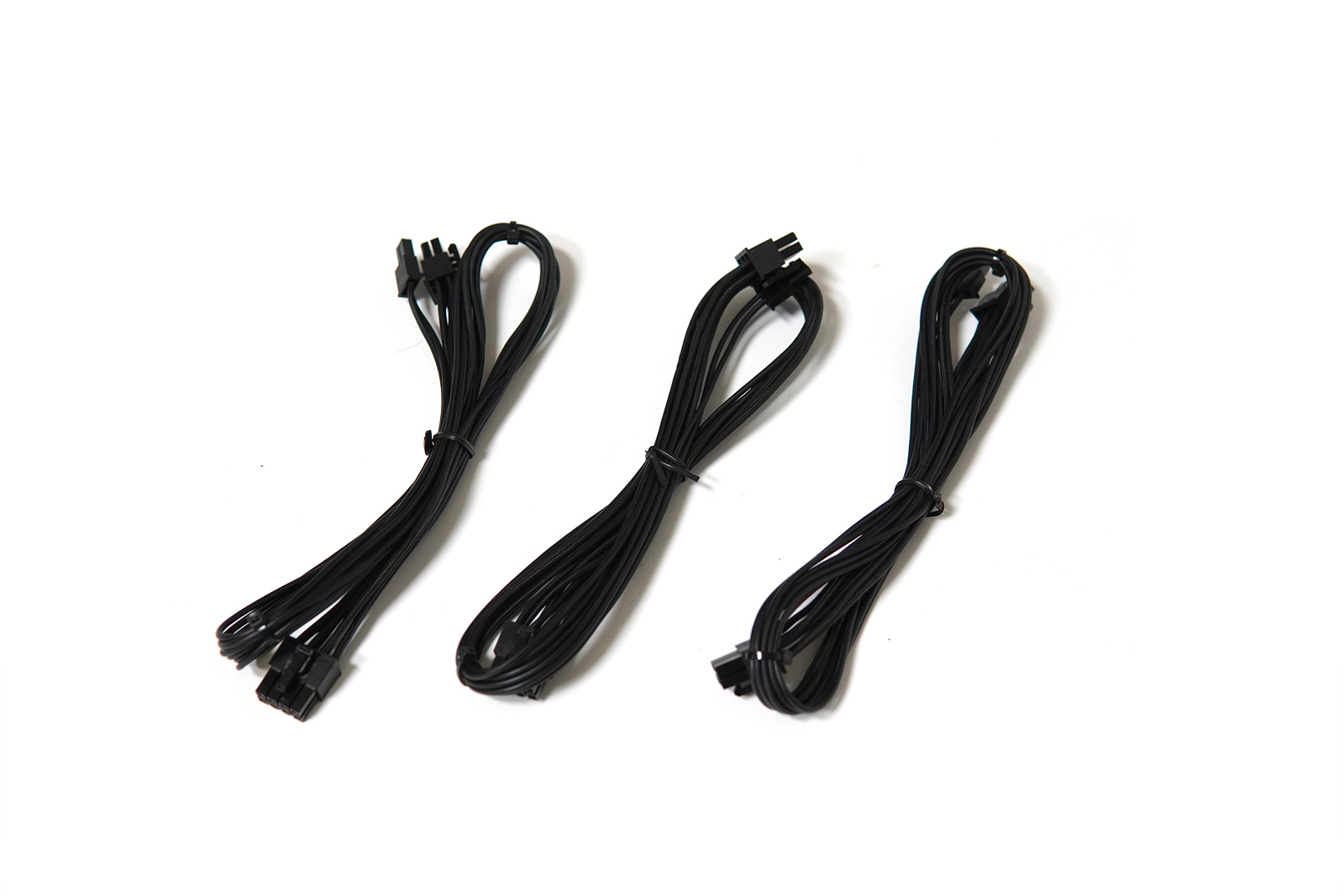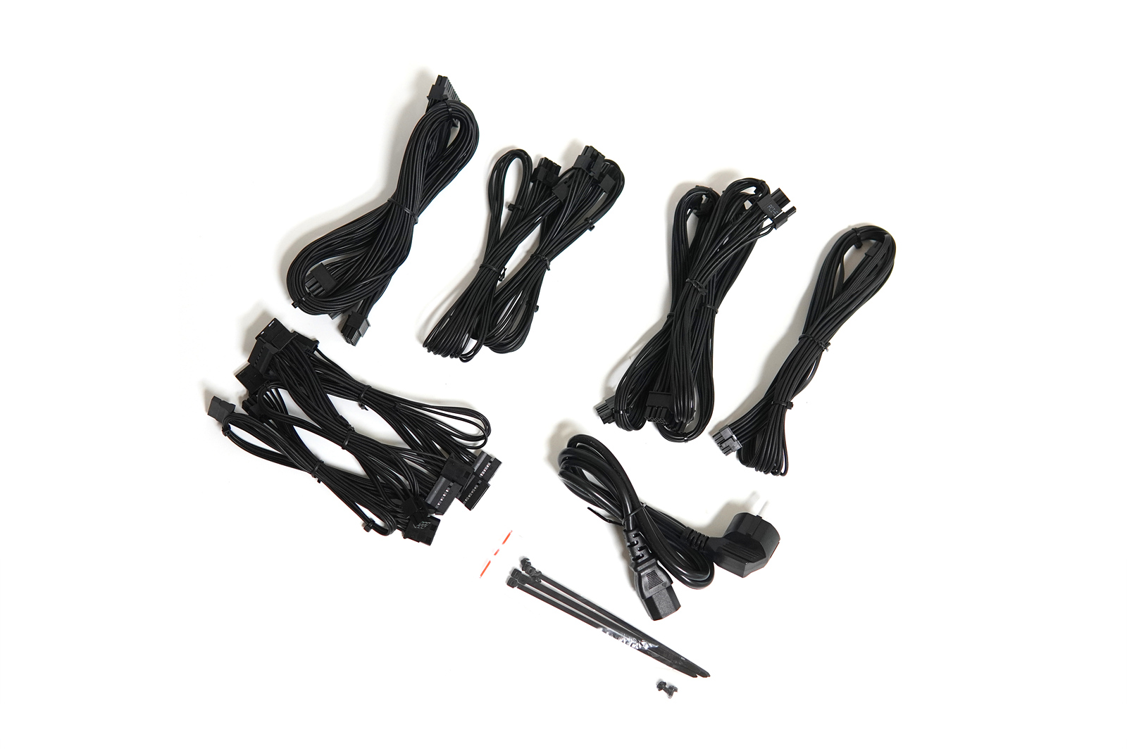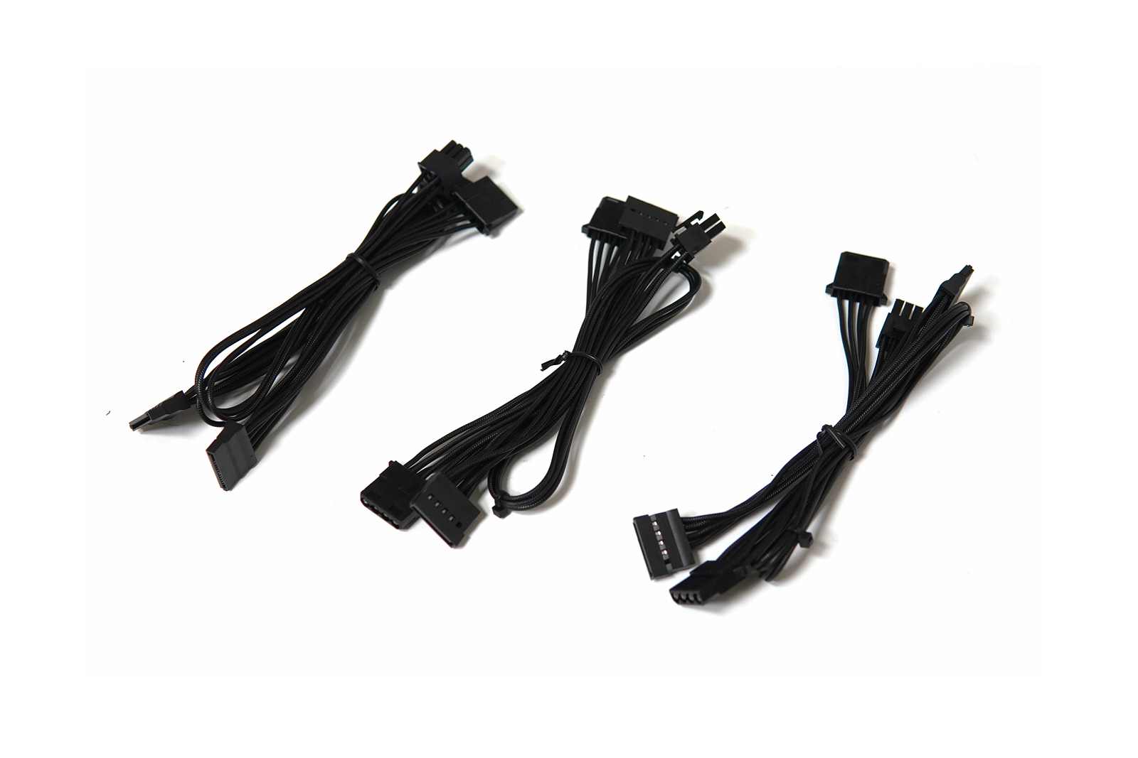 SATA / 모렉스 4핀 케이블은 3개가 있는데 각각 4개의 커넥터가 있어서 총 12개의 기기를 연결할 수 있습니다. 3개의 케이블은 SATA 3개 + 4핀 1개 / SATA 2개 + 4핀 2개 / SATA 2개 + 4핀 2개로 구성되어 있으니 필요한 상황이나 기기에 맞추어 사용할 수 있습니다.