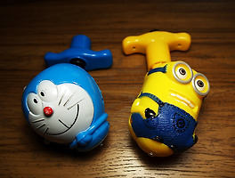 도라에몽 팽이 & 미니언즈 팽이 지난 주 동대문 완구 도매시장에서 구매한 재미난 아이템입니다. 가격은 2천원으로 아이들 선물용으로 적당하다고 생각됩니다. 원래는 네가지 종류가 있습니다. (도라에몽, 미니언즈, 헬로키티, 캡틴아메리카)해인/해승이는 키티를 안좋아하고 캡아는 퀄이 좀 떨어지는 편이라 에몽이와 미니언즈를 골랐습니다. 자 그럼 소개 들어갑니다. 요렇게 생겼습니다. 며칠 가지고 놀았더니 이런저런 상처가 많이 생겼네요. ㅜㅜ 바닥면은 저렇게 메탈로 되어있습니다. LED가 달려 있어서 팽이를 돌리면 불빛이 번쩍번쩍 합니다. @.@ 얼짱각도로~~ 이번에는 미니언즈입니다. 역시나 LED가 달려 있습니다. 태엽을 감아서 돌리는 방식입니다. 귀여운 녀석. ^^ 모자는 서로 호환이 됩니다. 에몽이는 대나무 헬리콥터를 단거 같네요. 자 이제는..