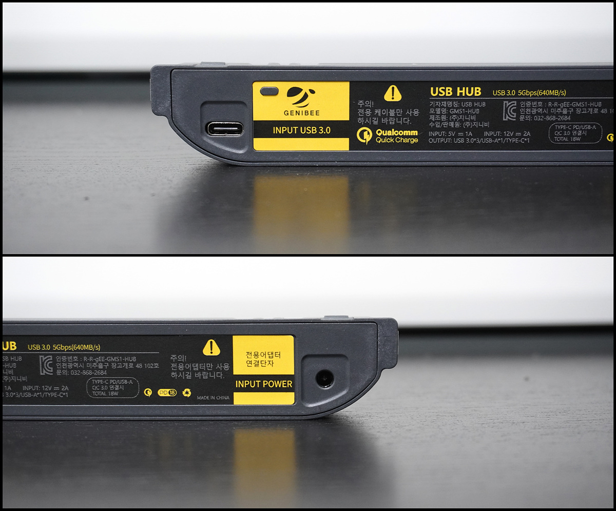 왼쪽은 PC와 연결하는 USB 포트(Type-C), 오른쪽에는 외장 어댑터용 포트입니다.