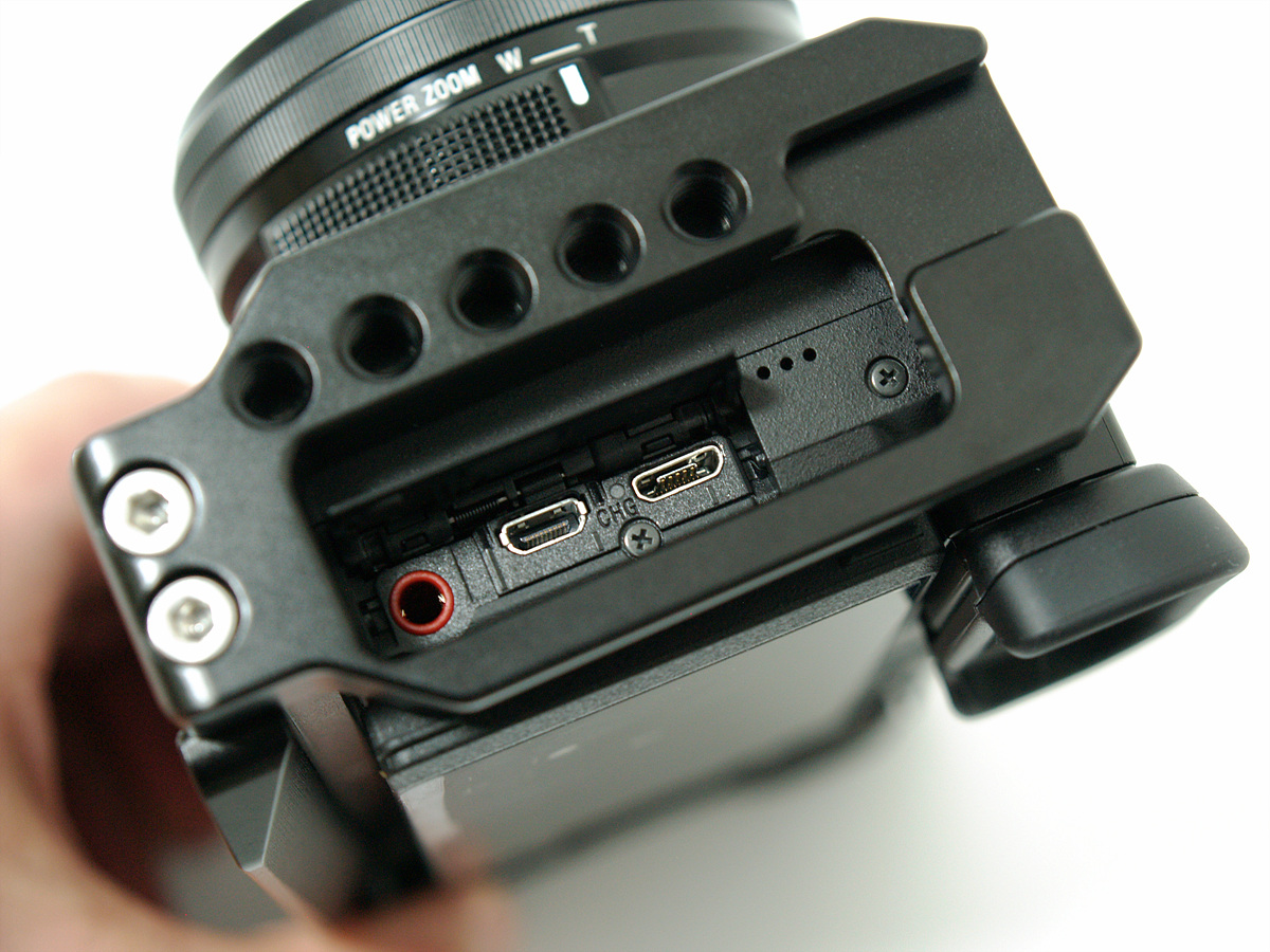 사이드 그립은 5개의 1/4인치 소켓이 있어서 추가로 스몰리그 핸들과 같은 액세서리 등을 연결할 수도 있고 퀵슈를 연결해 삼각대에 세로로 장착할 수도 있습니다. 위쪽에는 핫슈가 있어서 스트로보나 마이크를 장착할 수 있습니다.