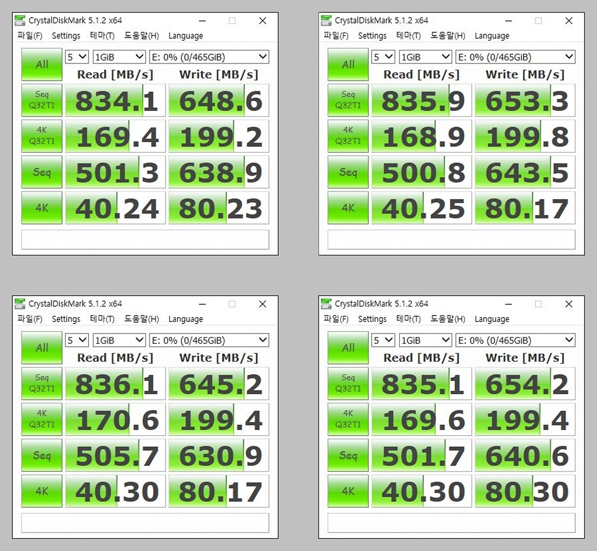 Crystal Disk Mark로 테스트를 해보니 속도가 상당히 인상적이였습니다. 순차 읽기의 경우 스펙상 최대 540MB/s라고 되어있는데 이보다 50%정도 더 빠르게 측정이 되었습니다. 그리고 4K의 쓰기부분 역시 상당히 빠른 모습을 보여주었습니다. 4K 쓰기로만 비교한다면 다른 제품에 비해 60%정도의 빠른 결괏값이였습니다.