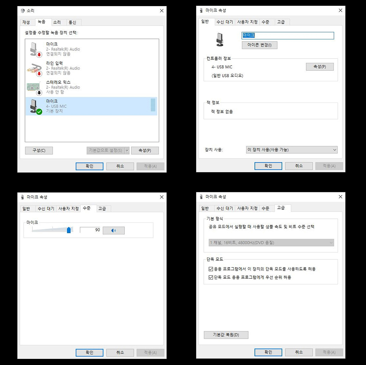 마이크가 인식이 되었음에도 녹음이 되질 않는다면 제어판 -> 소리 -> 녹음 탭에서 마이크가 기본 장치로 설정이 되었는지 확인을 해보시기 바랍니다. 마이크의 크기는 90으로 설정을 하였습니다.