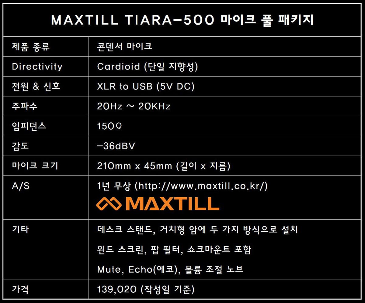 완벽한 풀 패키지 구성. 맥스틸 TIARA-500 마이크