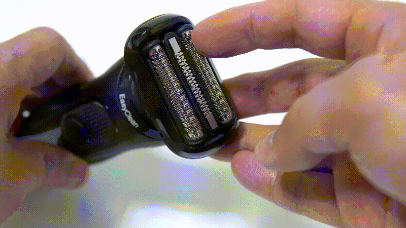 제품 가운데의 전원 버튼으로 면도기를 사용을 할 수 있습니다. Easy Clean이라는 문구처럼 면도기의 헤드를 분리하지 않은 상태에서도 헤드를 거꾸로 한채 간편하게 물로 세척할 수 있습니다.