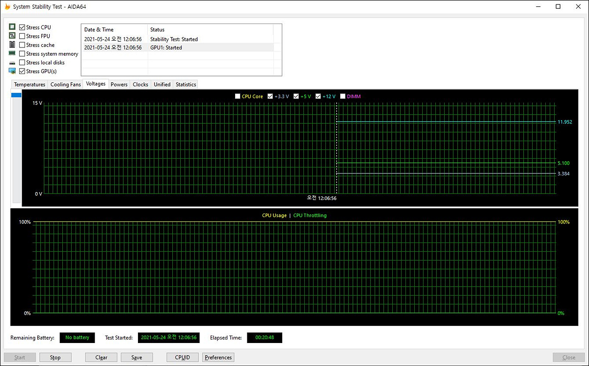 AIDA64에서는 20분간 스트레스 테스트를 진행하였습니다. 전업 변동률같은 경우는 S/W의 테스트는 의미가 없으므로 단순히 참고용으로만 봐주시기 바랍니다. 이 부분을 테스트하기 위해서는 오실로스코프나 전압을 측정할 수 있는 전문 장비가 필요합니다. 시스템에 로드를 건 상태에서도 고주파 노이즈나 팬 소음은 상당히 만족스러웠습니다. 늦은 시간 조용한 장소에서 간단한 작업을 할때는 제로팬 기능으로 더욱 쾌적하게 사용할 수 있습니다.