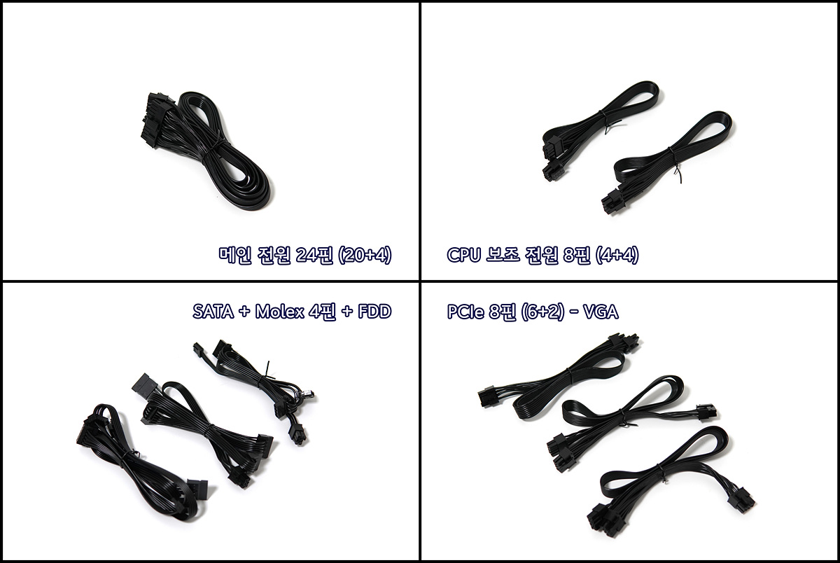 다른 제품들보다 VGA(PCIe)에 사용할 수 있는 케이블이 3개로 총 6개의 커넥터를 사용할 수 있습니다. 이정도면 대장급 3080뿐 아니라 3090의 8+8+8 전원을 가진 제품에서도 사용할 수 있습니다.