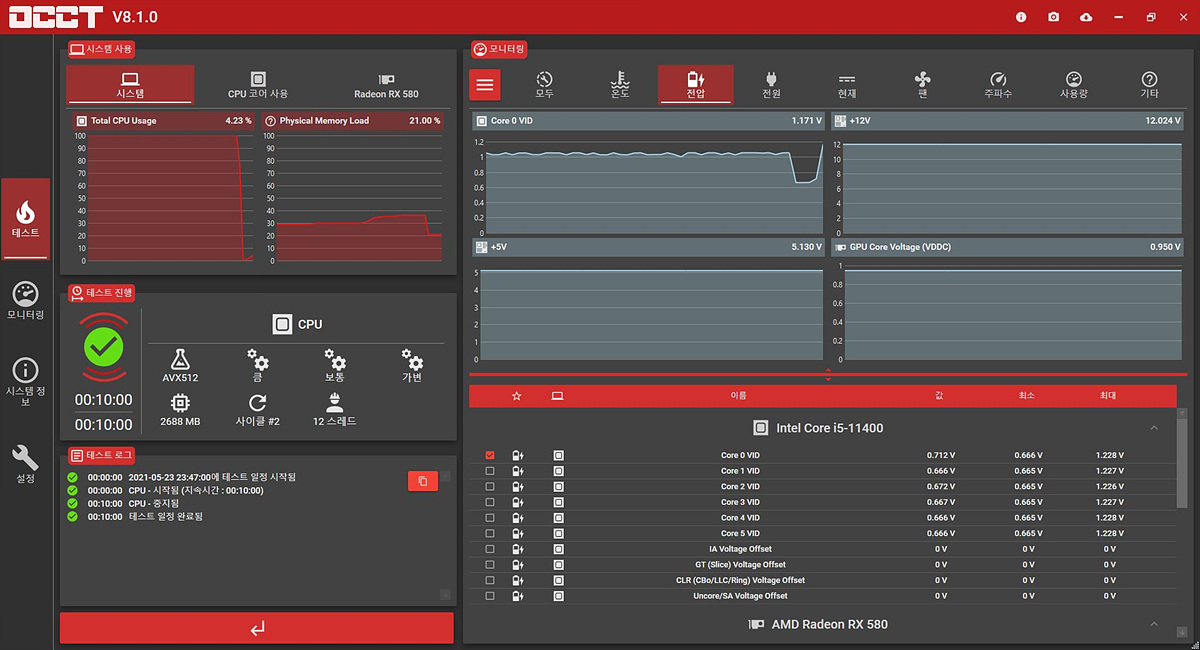 테스트는 인텔의 11세대 CPU와 라데온 RX 590 S.E로 진행을 했습니다. PCIe 8핀 케이블 하나에 커넥터가 두개 있지만 되도록이면 각각의 케이블마다 따로 전원을 연결하시는걸 추천합니다. 1,000W의 용량이라면 VGA 두세개 정도는 충분히 사용할 수 있는 용량으로 요즘 많이 하는 채굴용 PC에서도 사용할 수 있습니다. 물론 3080급을 6개정도 사용한다면 좀 더 큰 용량이나 갯수를 좀 더 늘려서 사용해야 됩니다.