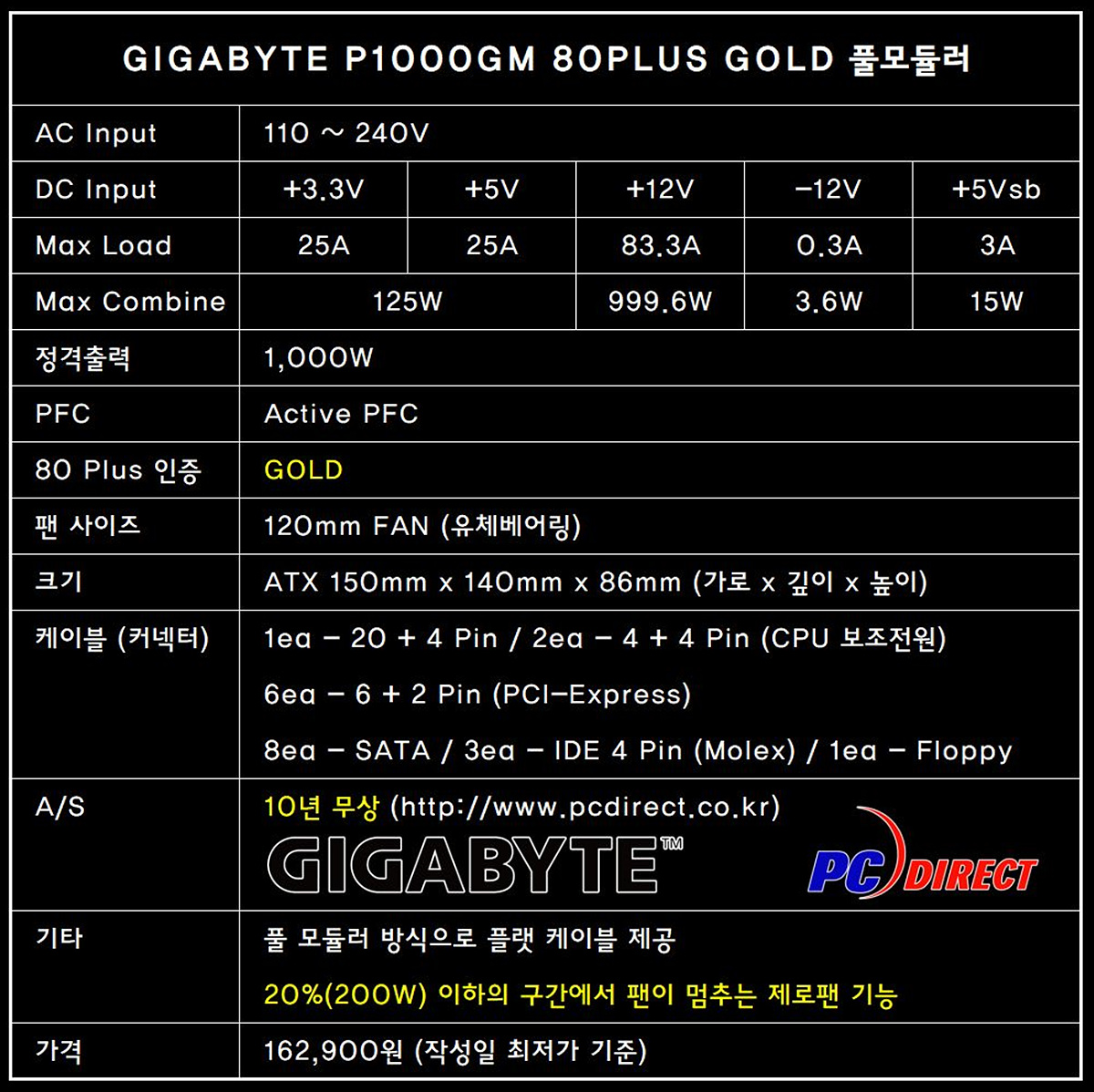 이번 시간에 소개하는 기가바이트의 P1000GM 파워는 이런 시장의 상황에 잘 맞는 제품으로 고사양 시스템을 갖추고 있는 사용자들이 원하는 사양들을 모두 갖추고 있는 제품입니다.