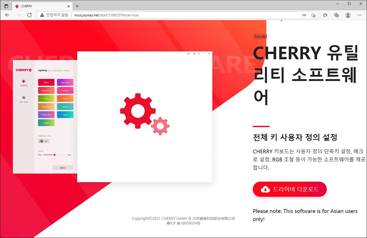 체리(Cherry) 키는 FN 키와 조합으로 사용이 되지만 단독으로도 사용이 가능합니다. 체리 키를 3초가량 누르고 있으면 전용 소프트웨어를 다운받을 수 있는 체리 홈페이지로 연결이 됩니다. 소프트웨어를 설치후에는 체리 키를 누르면 프로그램이 실행이 됩니다.
