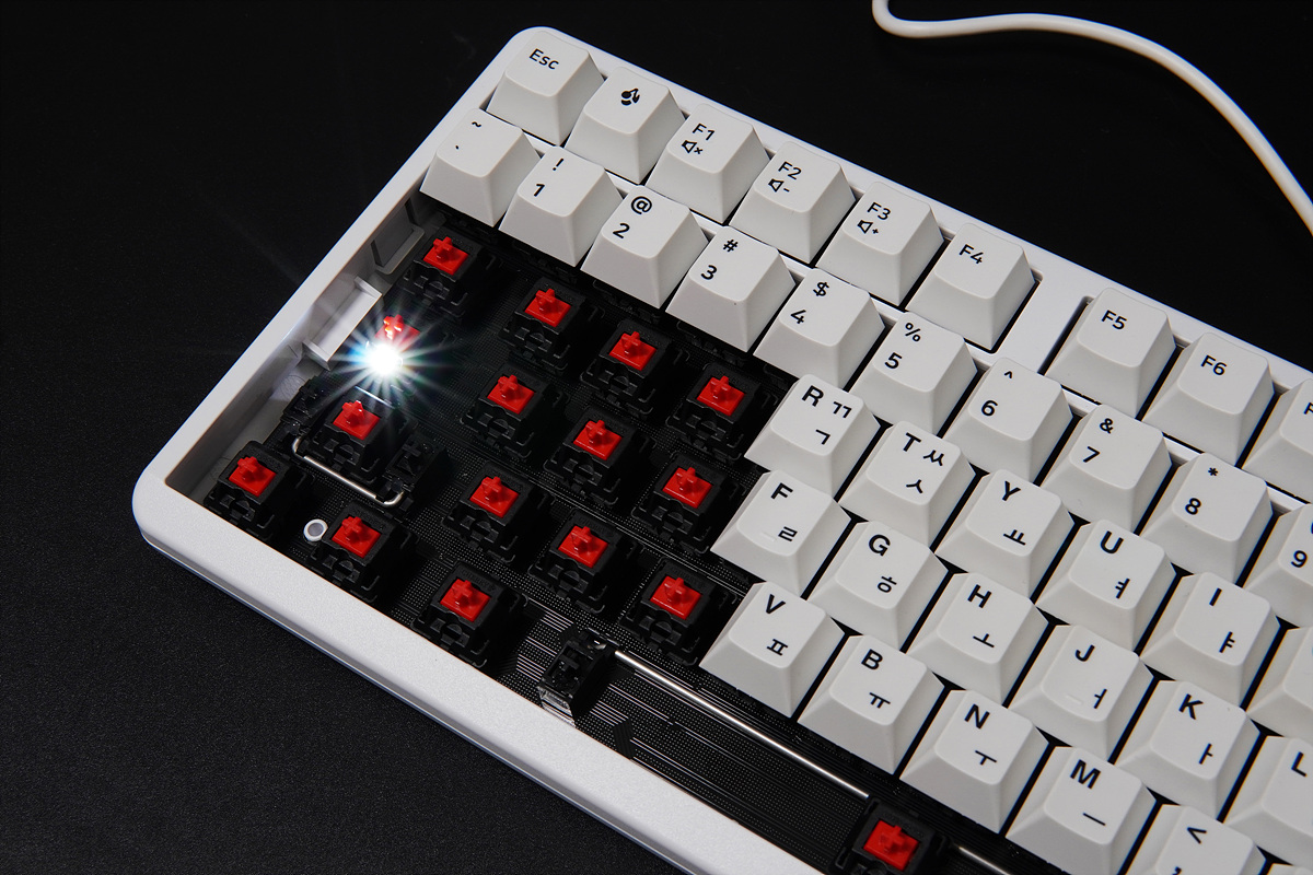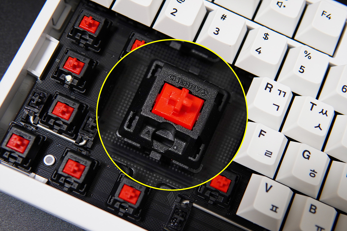 스위치와 기판이 그대로 노출이 되어있는 무보강 타입으로 타건감 역시 많이 달라지게 됩니다. 보강판을 사용한 제품은 사용자에 따라 호불호가 달라지는 부분으로 무조건 무보강 키보드가 좋다~라고 할수는 없습니다. 현재 무보강 방식은 체리에서만 출시를 하고 있기때문에 희소성은 있는 편입니다.