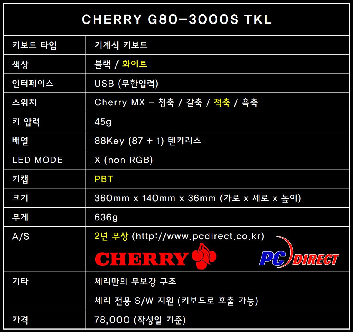 기계식 키보드를 선택할때 체리 스위치 or 그 밖에 다른 스위치로 선택을 했지만 이제는 체리 키보드 or 체리 스위치를 사용한 키보드로 선택을 할 수 있을만큼 체리 키보드의 종류가 엄청나게 많아졌습니다. 이전에는 특정 모델이나 특정 스위치를 사용한 제품만 출시가 되었지만 피씨디렉트에서 유통을 한 뒤로는 출시하는 모든 제품들에 색 (블랙 / 화이트), 스위치 (청 / 갈 / 적 / 흑 / 저소음)와 LED (RGB / non RGB) 유무까지 정말 많은 제품들이 나오고 있습니다. 이번에 소개하는 G80-3000S TKL 키보드 모델명 하나로 8개의 제품이 있으며 RGB 적용까지 따지면 총 16개나 될만큼 많은 종류가 있습니다.
