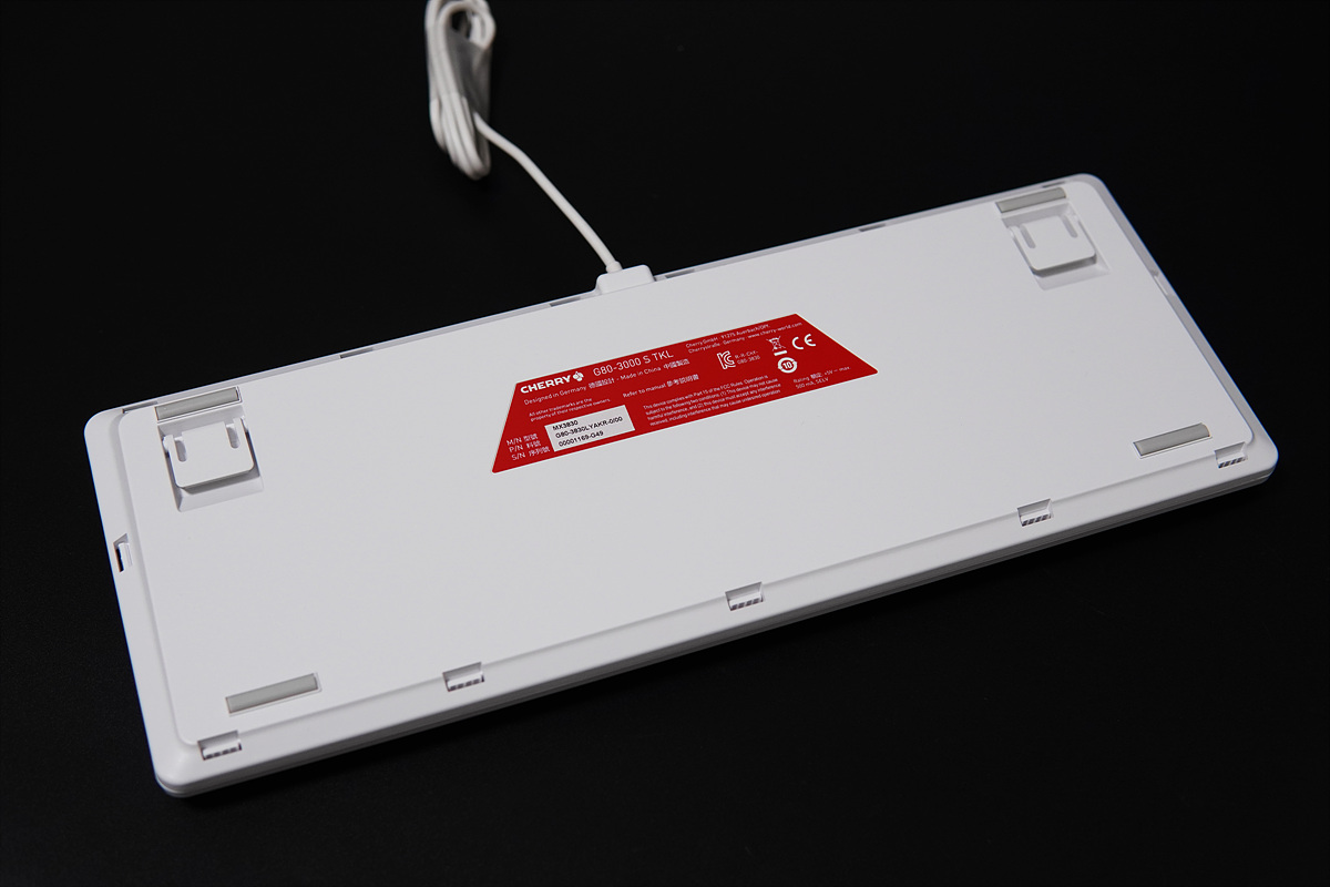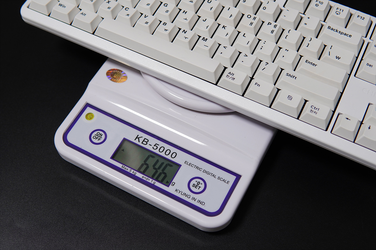 체리 키보드는 별도의 보강판이 없는 구조라 다른 키보드들에 비해 무게가 많이 가벼운 편입니다. 이 제품은 텐키리스로 크기와 무게 역시 더 작고 가벼운 편입니다. (케이블은 제외한 무게입니다.)