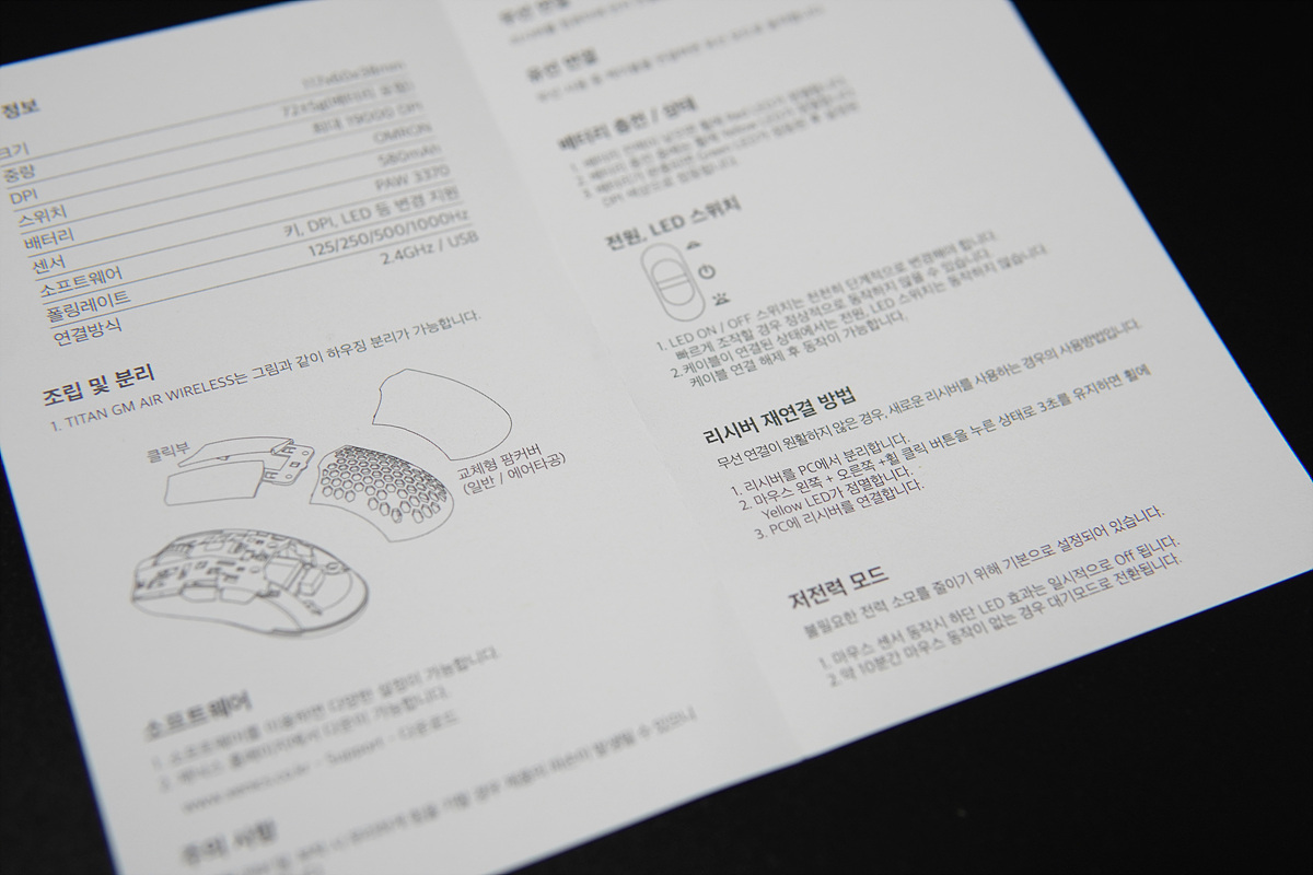 타이탄 GM AIR 무선 마우스의 스펙을 간단히 정리해보았습니다. 마우스의 심장이라고 할 수 있는 센서는 3370이 사용되었으며 기존의 제품들과 동일하게 6개의 버튼(5+DPI)과 파라코드 케이블을 통해 무선뿐 아니라 유선으로도 사용할 수 있습니다. 기존의 GX AIR 무선 마우스와 달라진게 있다면 가로 세로의 크기와 함께 10%정도 가벼워진 무게입니다. 그래서 제품의 이름도 mini를 뜻하는 GM으로 바뀌게 되었습니다.