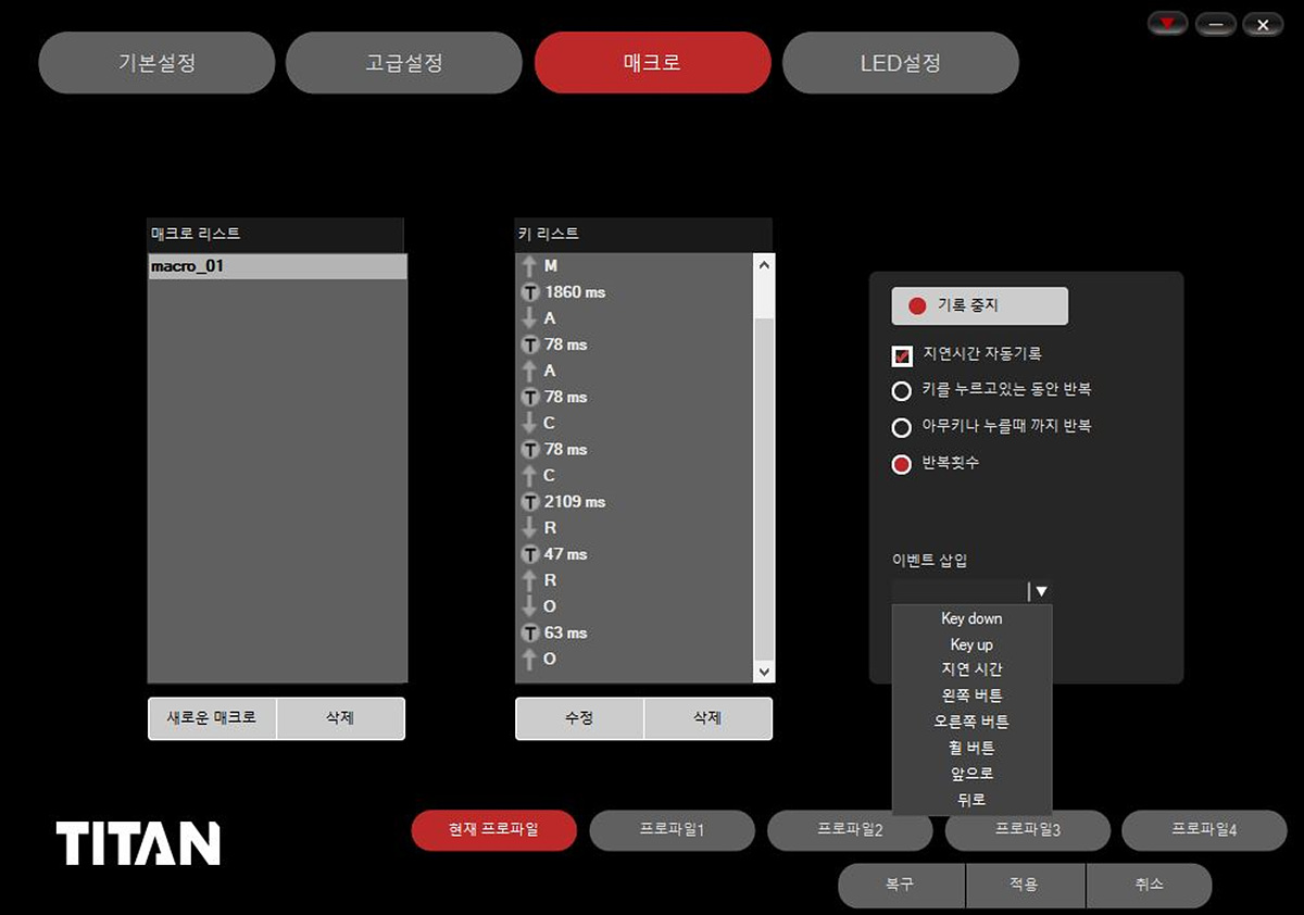 매크로는 키보드의 입력 지연시간뿐만 아니라 여러가지 이벤트(액션)를 넣을 수 있습니다.
