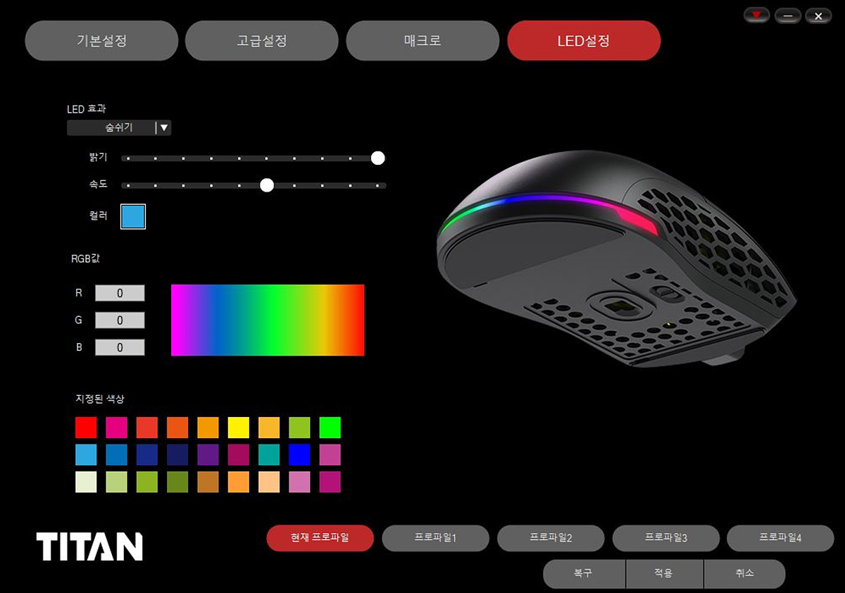 LED 모드는 고정 / 숨쉬기 / 스트리밍 으로 선택할 수 있으며 LED가 부담스럽거나 배터리 효율을 위해서 LED를 끌 수도 있습니다. 타이탄 무선 시리즈의 경우 배터리 효율을 위해서 마우스가 움직이지 않을때만 RGB LED가 켜지게 되고 마우스를 사용(움직일때)할때는 LED가 자동으로 꺼지게 됩니다.