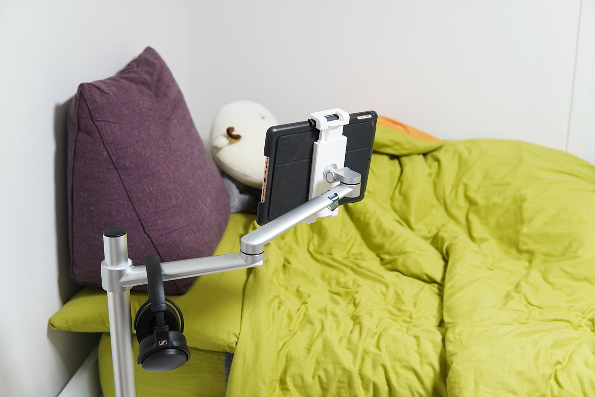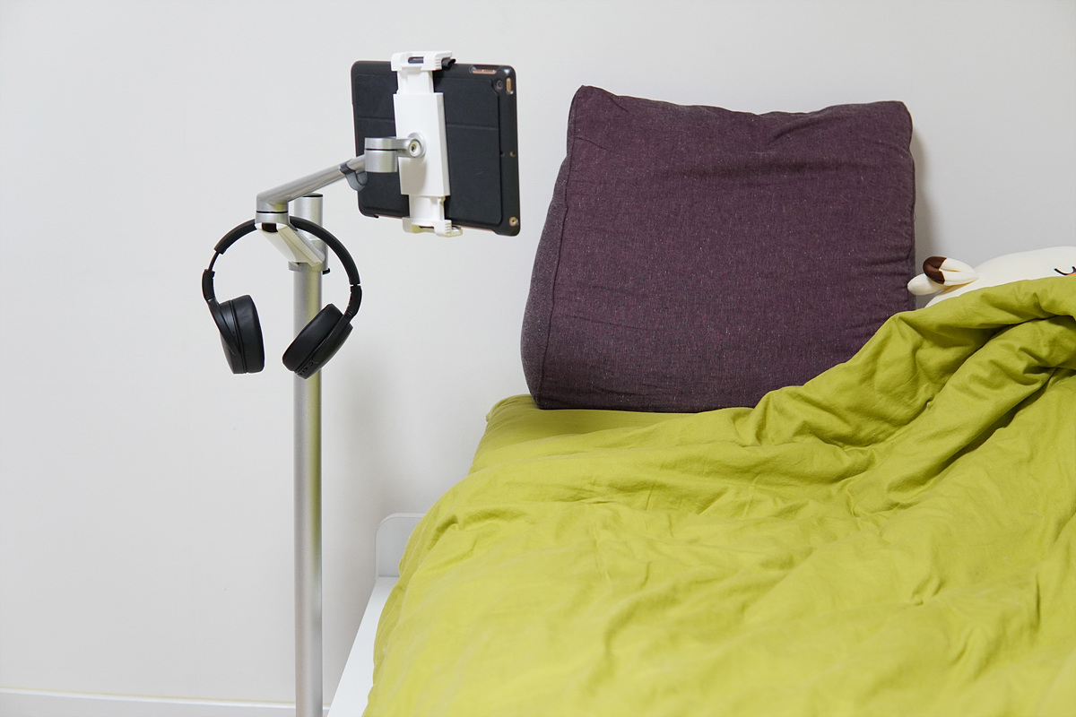 개인적인 생각이지만 이 제품을 가장 유용하게 사용할 수 있는곳은 바로 침대라고 생각합니다. 저같은 부모 입장에서는 좀 별로이지만 딸아이처럼 대부분의 시간을 침대에서 보내는 분들이라면 참 유용한 아이템이죠. 사진의 태블릿은 애플의 아이패드로 케이스를 장착한 상태에서도 사용할 수 있습니다.