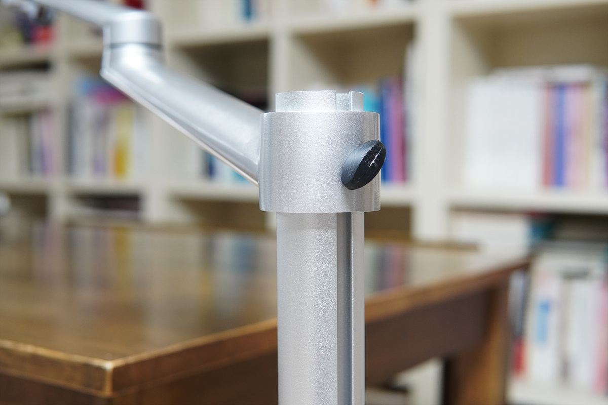 암(Arm)을 고정한 뒤 마찬가지로 구멍에 맞추어 고정을 할 수 있습니다. 손나사를 통해서 암(arm)을 고정할 수 있으며 홈을 통해서 전체적인 높이를 조절할 수 있습니다.