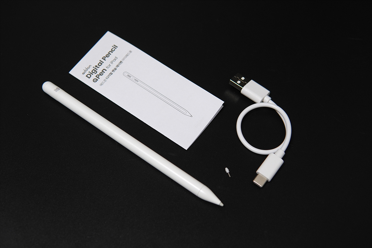 aPen 본체, 충전 케이블, 추가 펜촉과 설명서로 이루어져 있습니다. 디자인은 누가 봐도 애플 액세서리라고 생각할 만큼 화이트 콘셉트로 되어있습니다.