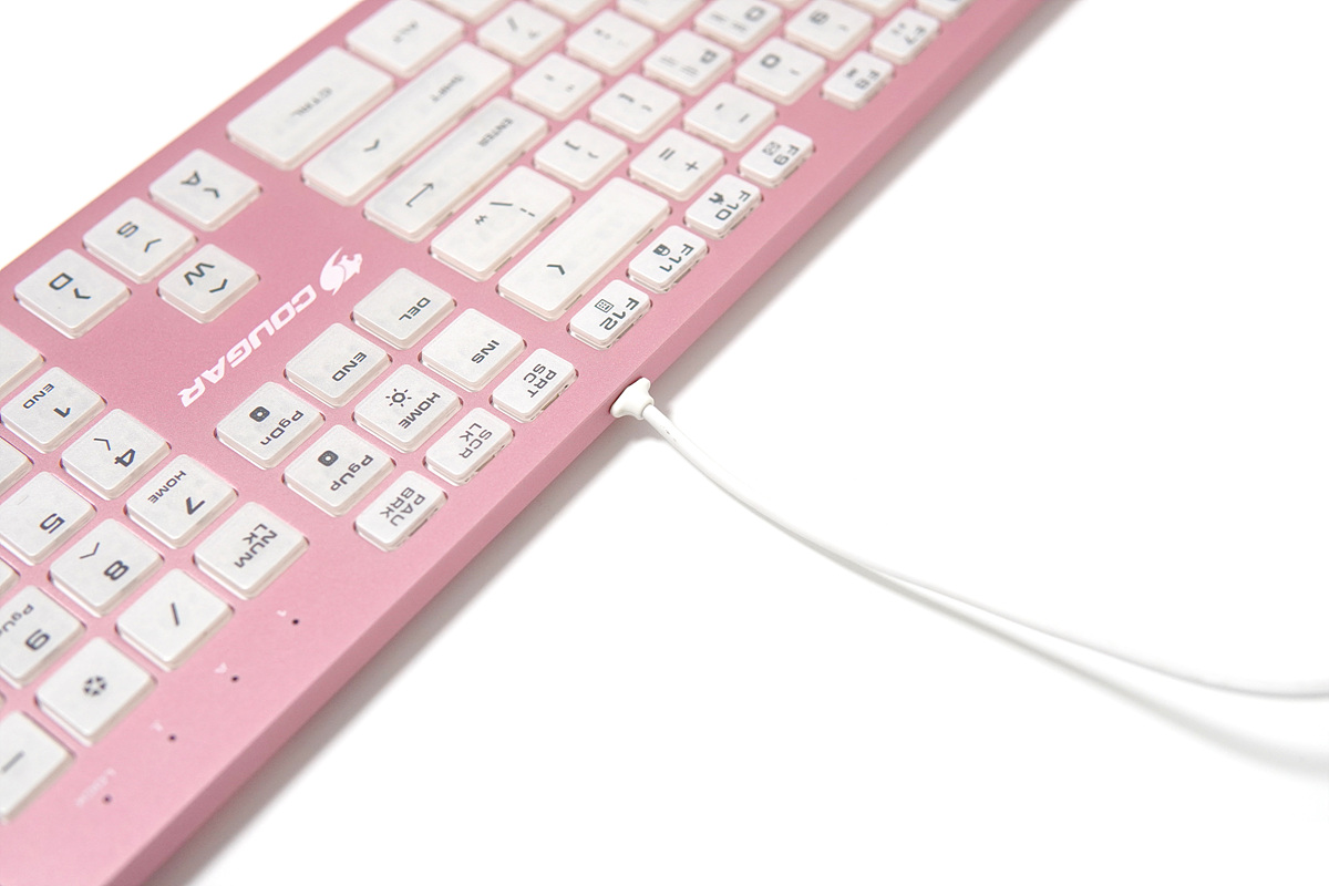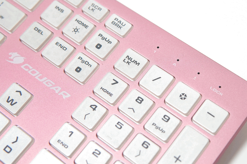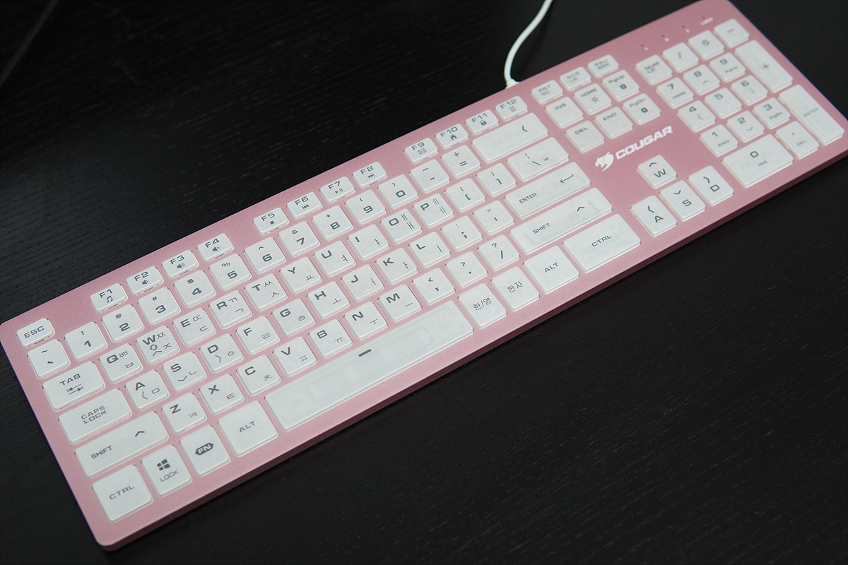 멤브레인이나 기계식 키보드와는 다른 디자인과 독특한 키감 때문에 펜타그래프 방식의 키보드 역시 마니아층이 제법 많은 편입니다. 이런 펜타 방식에 눈에 확~~ 띄는 핑크색의 알루미늄 하우징은 더욱 시선을 집중시키고 있습니다. 논란의 민트 초코처럼 실제로는 호불호가 많이 갈릴 거라 생각합니다. 그래서인지 이런 제품을 출시한 쿠거(COUGAR)에 용기에 키보드를 좋아하는 사용자로서는 박수를 쳐주고 싶습니다.