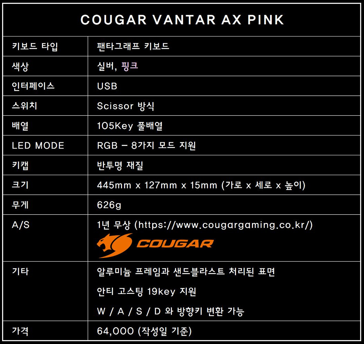 날씬한 분홍색 고양이. COUGAR VANTAR AX Pink 키보드