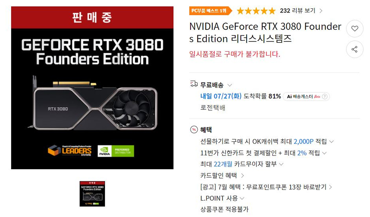 가격이 조금 내려가긴 했지만 아직까지 그래픽카드의 가격이 정상화될 기미가 보이질 않네요. 그래서 오늘도 3080 FE에 도전을 했습니다.
