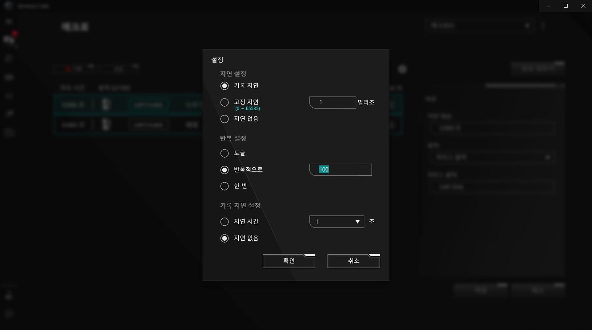 매크로의 경우 키보드 입력과 마우스의 광클릭(반복 설정)을 따로 지정할 수 있습니다. 아머리에서 매크로 설정을 한 뒤 스마트 기기에 연결(블루투스)하더라도 매크로는 사용할 수 없으니 참고하세요.