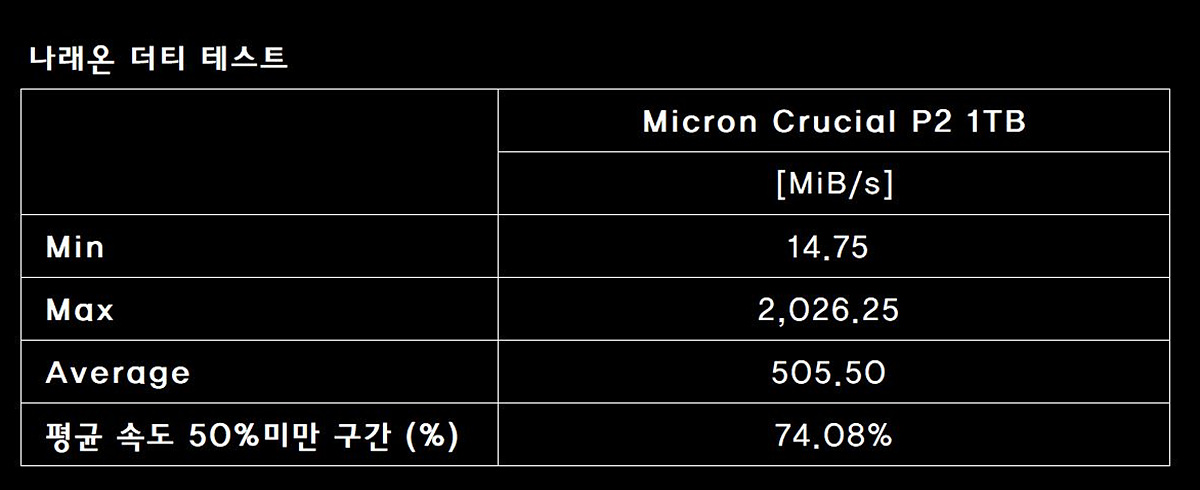 0~100%까지 SSD의 모든 구간을 쓰는 나래 테스트에서는 QLC, 디램리스의 한계를 확실히 보여주었습니다. 그래도 지난 P1에 비한다면 많이 좋아진 모습이었습니다.