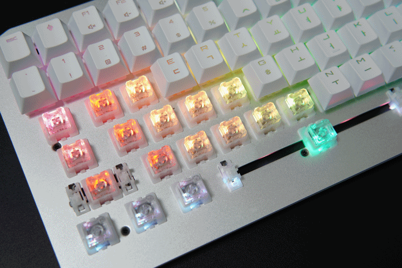 키캡을 분리하면 비올라 스위치를 확인할 수 있습니다. 비올라 스위치의 하우징은 투명하게 되어있어서 기존 MX 스위치보다 RGB LED의 효과를 더욱더 잘 표현할 수 있습니다.