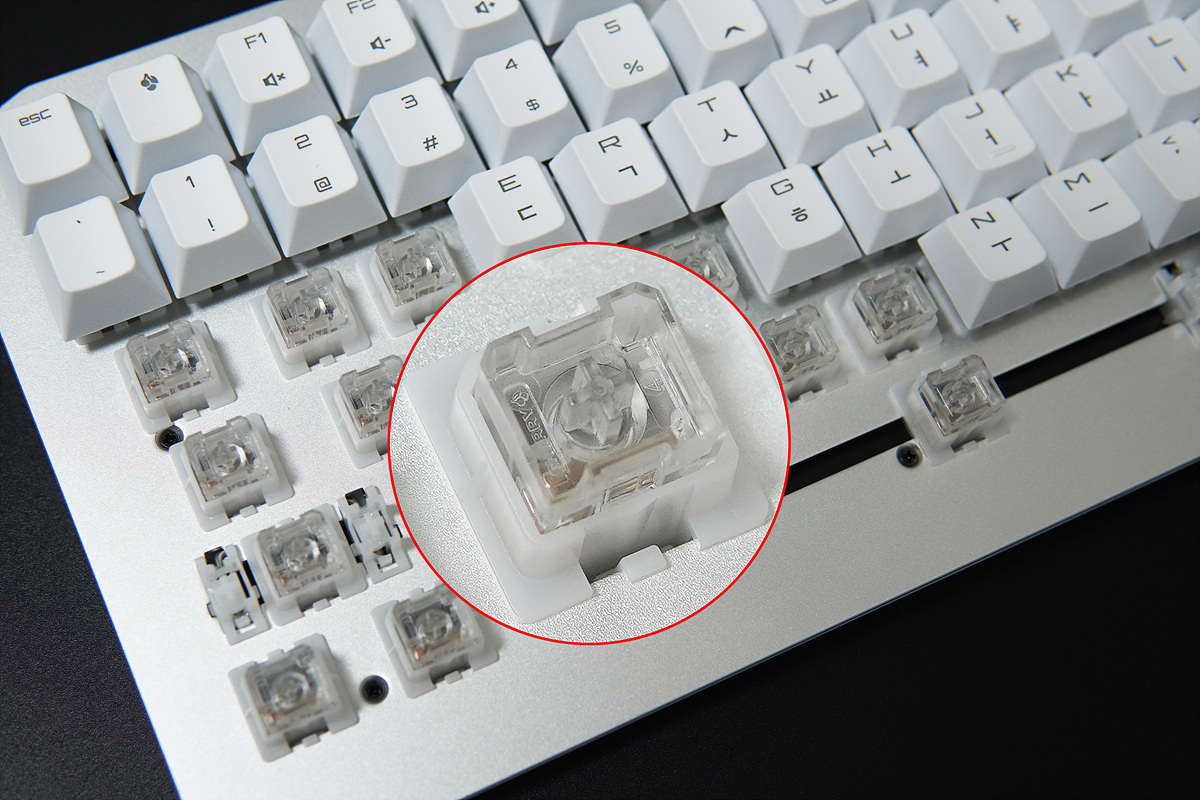 키캡과 결합되는 십자 돌기 부분까지 투명으로 되어있는 투명 하우징은 체리 키보드에서 약점으로 지적되었던 RGB 효과를 더욱 높여주어서 RGB를 좋아하는 사용자들에게는 꽤나 매력적일 거라 생각합니다.