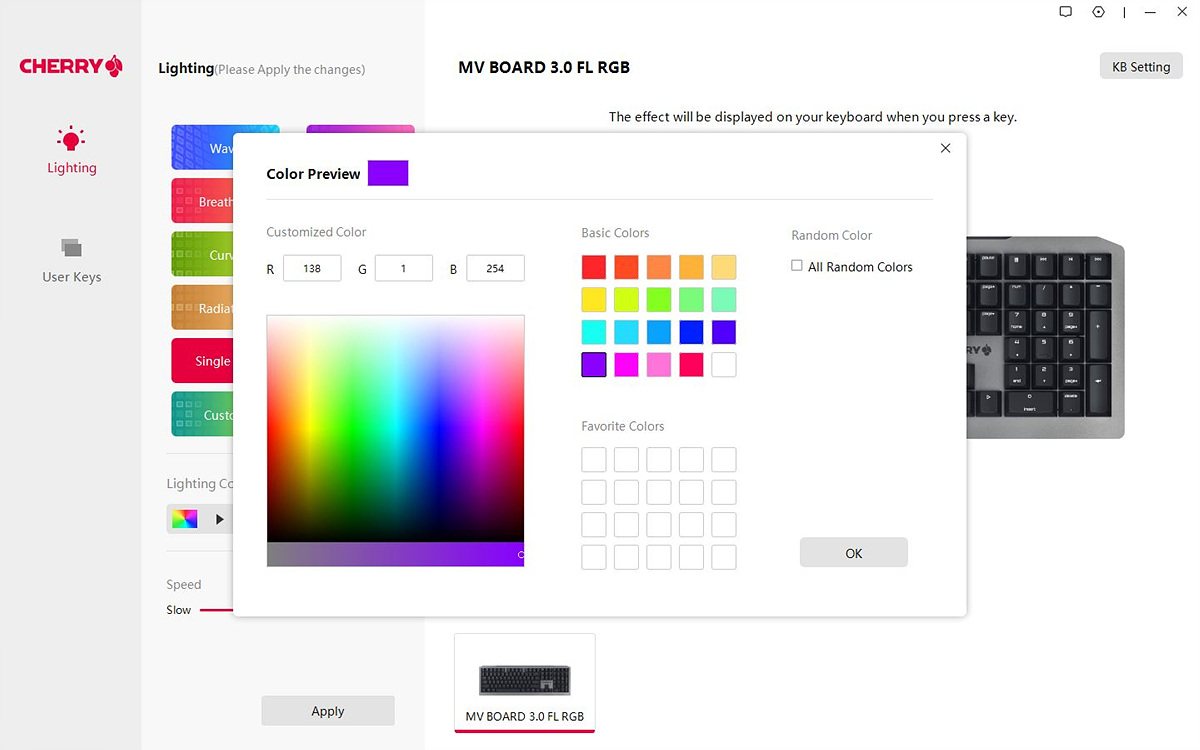 모드에 따라 LED의 색을 바꿀 수 있고 커스텀 모드에서는 각각의 키별로 색을 바꿀 수 있습니다. RGB LED 답게 모든 색은 255,255,255 값으로 입력할 수 있습니다.