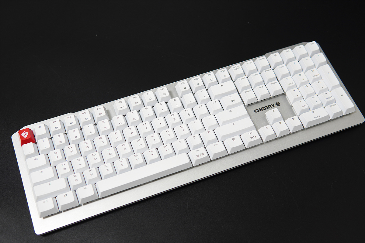 알루미늄 상판의 비키 스타일이라서 기존에 보던 체리 키보드와는 많이 다른 모습이었습니다. 실버의 알루미늄 상판과 흰색의 키캡이 상당히 깔끔한 느낌이라 다지인은 마음에 들었습니다. 키보드는 무조건 블랙이라고 생각했는데 요즘은 화이트 계열이 더 끌리더군요.