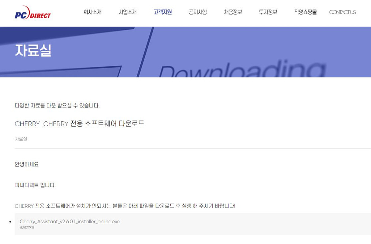 Esc와 F1 사이의 체리 키(key)를 4-5초가량 누르고 있으면 전용 소프트웨어를 다운로드할 수 있는 사이트로 바로 이동이 됩니다. 체리 키보드를 많이 사용해봤는데 이번에는 이 키가 제대로 동작을 하지 않더군요. 이상해서 다른 PC에 연결해보니 정상적으로 동작을 했습니다. 아마도 PC의 설정에 따라서 조금씩 오류가 있는 거 같습니다. 혹시나 체리 웹 사이트로 접속이 되지 않는다면 공식 유통사인 피씨디렉트 자료실에서도 다운로드할 수 있습니다.