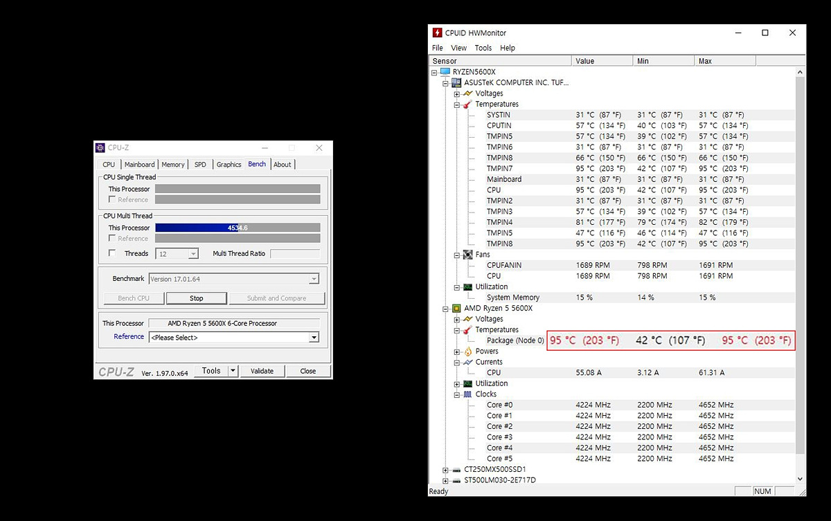 제품을 설치하고 CPU-Z로 풀로드를 한 상태에서 온도 테스트를 하는데 사진처럼 CPU 온도가 95도로 너무 높더군요. 쿨러가 조용해서 그런가 싶어서 확인을 해보니 1691 rpm으로 돌고 있음에도 온도가 비정상적으로 높더군요. 제가 테스트를 한 환경이 오픈 케이스(테스트 벤치)라서 온도에서는 좀 더 유리한데도 불구하고 이런 온도는 이해가 되질 않더군요.