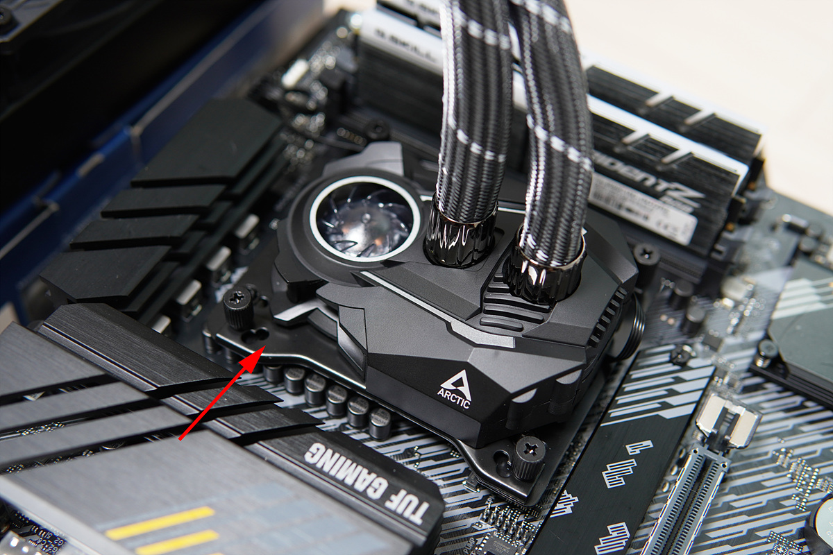 화살표 부분의 가이드는 펌프에 연결한 뒤 메인보드에 설치되어있는 클립과 연결이 되지만 PDF 설명서에는 이 부분에 대한 설명이 빠져있더군요. 유튜브 영상에는 이런 내용들이 포함되어 있으니 조립하기 전 미리 영상을 꼭 확인하시기 바랍니다.