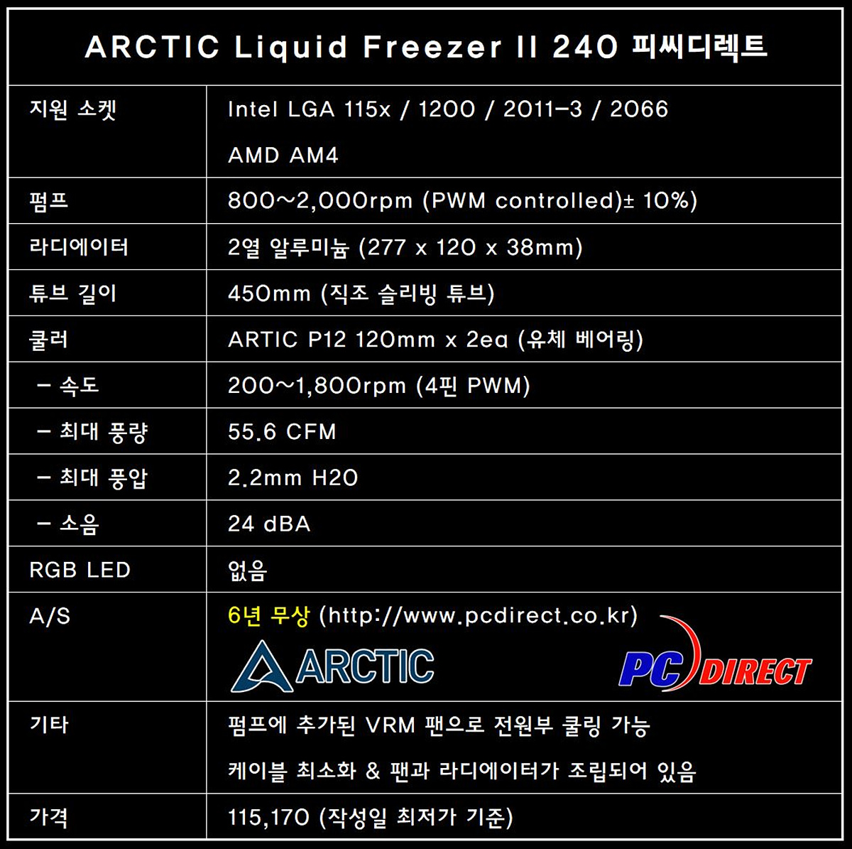 아틱 제품은 피씨디렉트에서 공식 유통을 하고 있습니다. 체리 키보드 유통도 그렇지만 아틱 제품 역시 다른 제품들보다 고객지원이 1년 추가가 된 6년을 제공합니다. 일부 저가형들이 3-4년 정도이고 대부분 5년을 지원하는 점을 생각한다면 반가운 부분이죠. 아틱 수랭 제품은 처음 사용을 해봤는데 주변이나 하드웨어 커뮤니티에서의 평이 상당히 좋아서 기대가 되더군요. 특히나 시끄러운 수랭 쿨러는 무조건 아틱 팬으로 교체하라는 글을 자주 보았습니다. 실제로 제품의 성능은 어떨지 살펴보도록 하겠습니다.