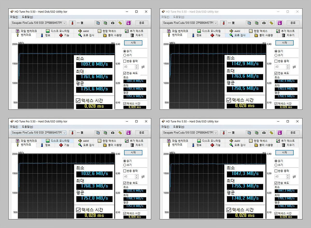 HD Tune Pro는 수치적인 부분도 중요하지만 측정 그래프가 튀지 않고 일정하게 유지되는 게 상당히 중요하기 때문에 숫자와 그래프 모두를 확인해야 합니다.